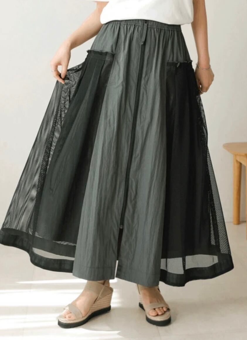 ■POINTナイロン×メッシュの異素材コンビでスポーティブルな要素を取り入れつつ、女性らしさのあるフレアシルエットに仕上げたスカート。スポーティブルでカジュアルなのに、大人が着てきちんと見えるのがポイントです。ロー切替のサイドメッシュ部分は深めのタックで動きが出るように仕上げました。着脱は、フロントジップオープン。ウエストはオールゴムでストレスフリーです。