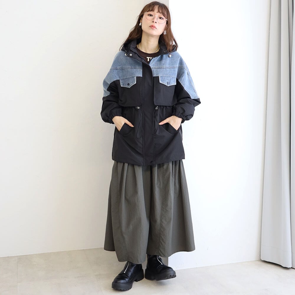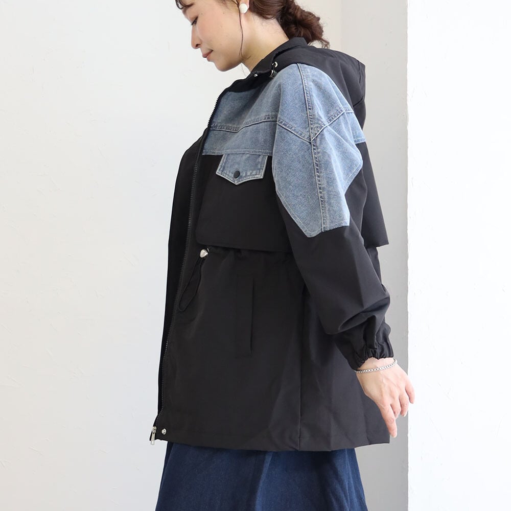 デニム使いがおしゃれなハーフ丈のフーディコート秋、冬、春先と1ロングシーズン活躍すること間違いなし♪大人のデニムスタイルをきれいめに仕上げてくれそうな1着です