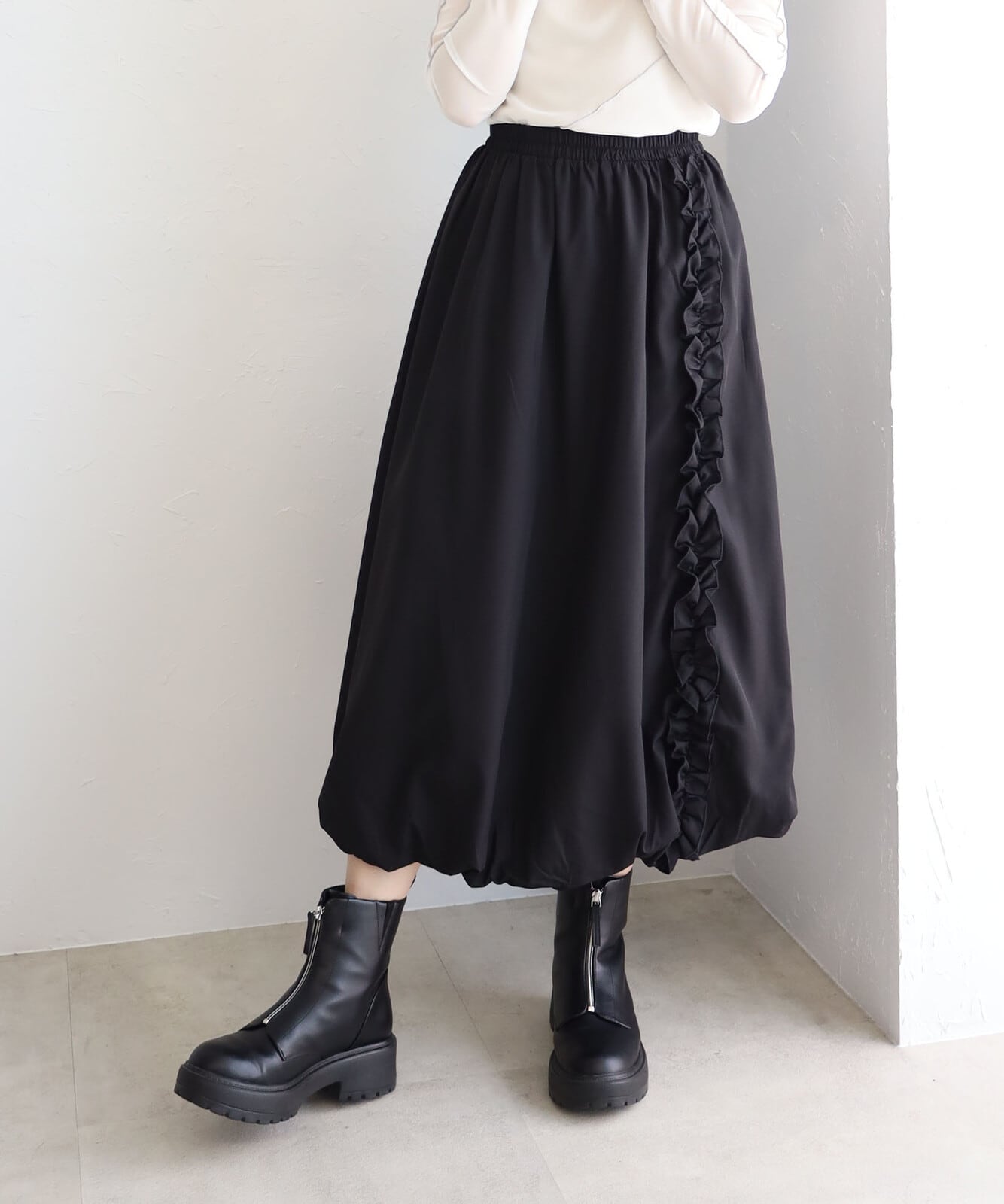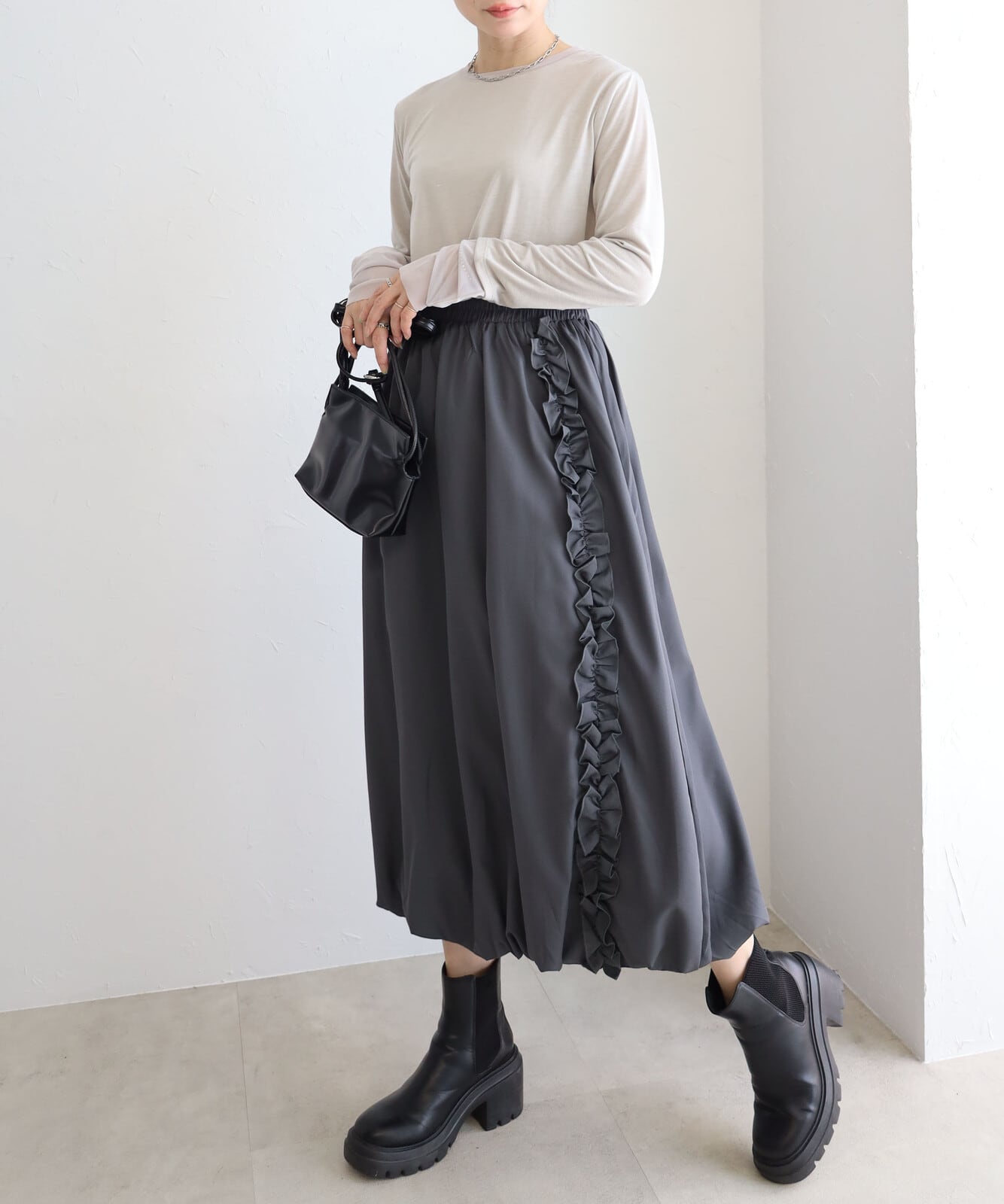 セレクション ミセス ヤングミセス レディース オトナ フリーサイズ モード モノトーン 40代 50代 60代 70代 80代 ゆったり ビックシルエット 大きいサイズ オーバーサイズ おしゃれ かっこいい かわいい カジュアル インナー ラウンド 長袖 フリル レイヤード 上品 フェミニン 伸縮性 ストレッチ hanahana シュシュ 秋冬 AW
