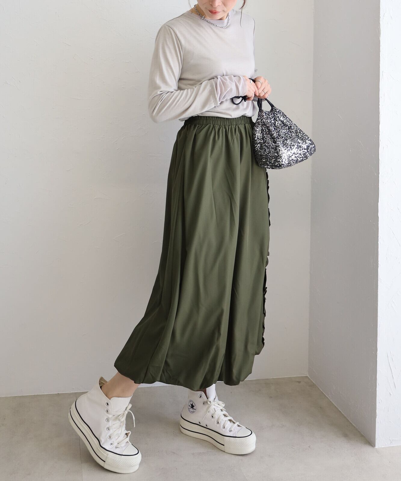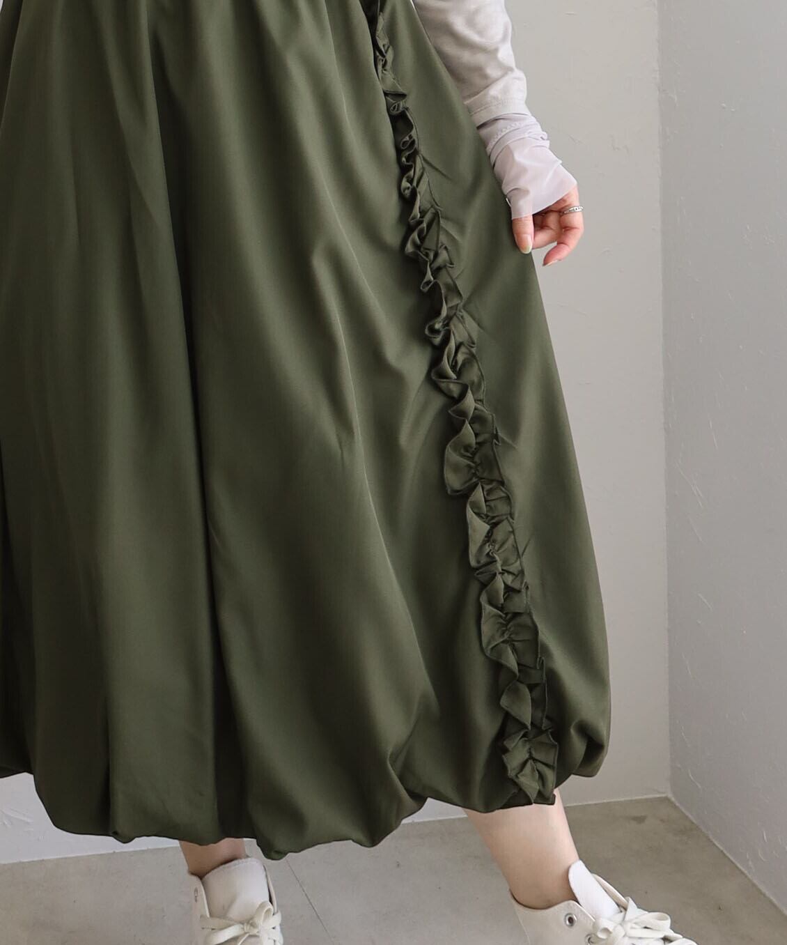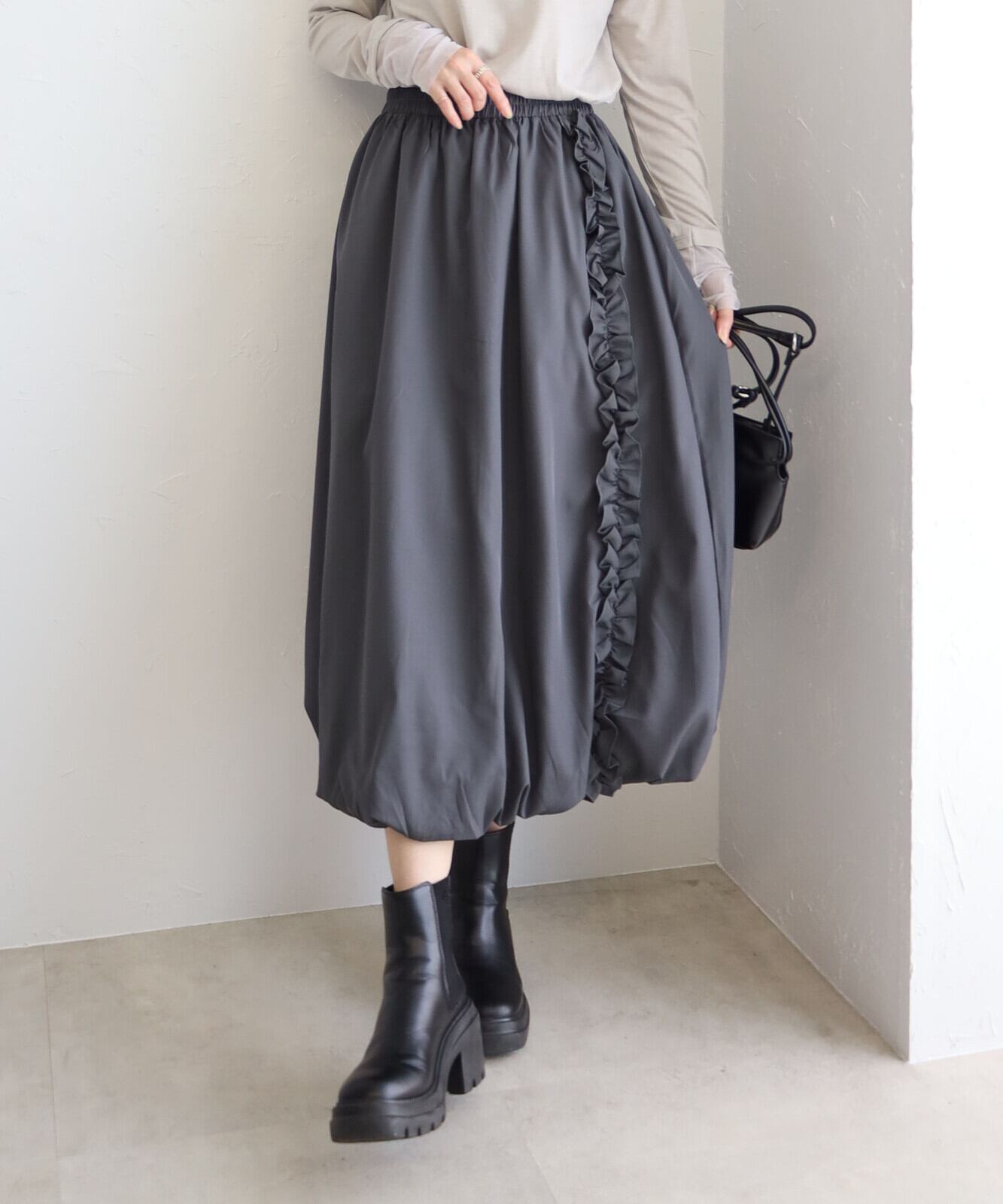 サラッとしたシャリ感がこなれた印象を与えるナイロン素材のバルーンスカート裾に向かって丸みを描く立体シルエットが軽快な動きを演出し足元までおしゃれ見えウエストゴム仕様で実用性も抜群カラーによって雰囲気もガラリと変わる着回し力の高い1枚です