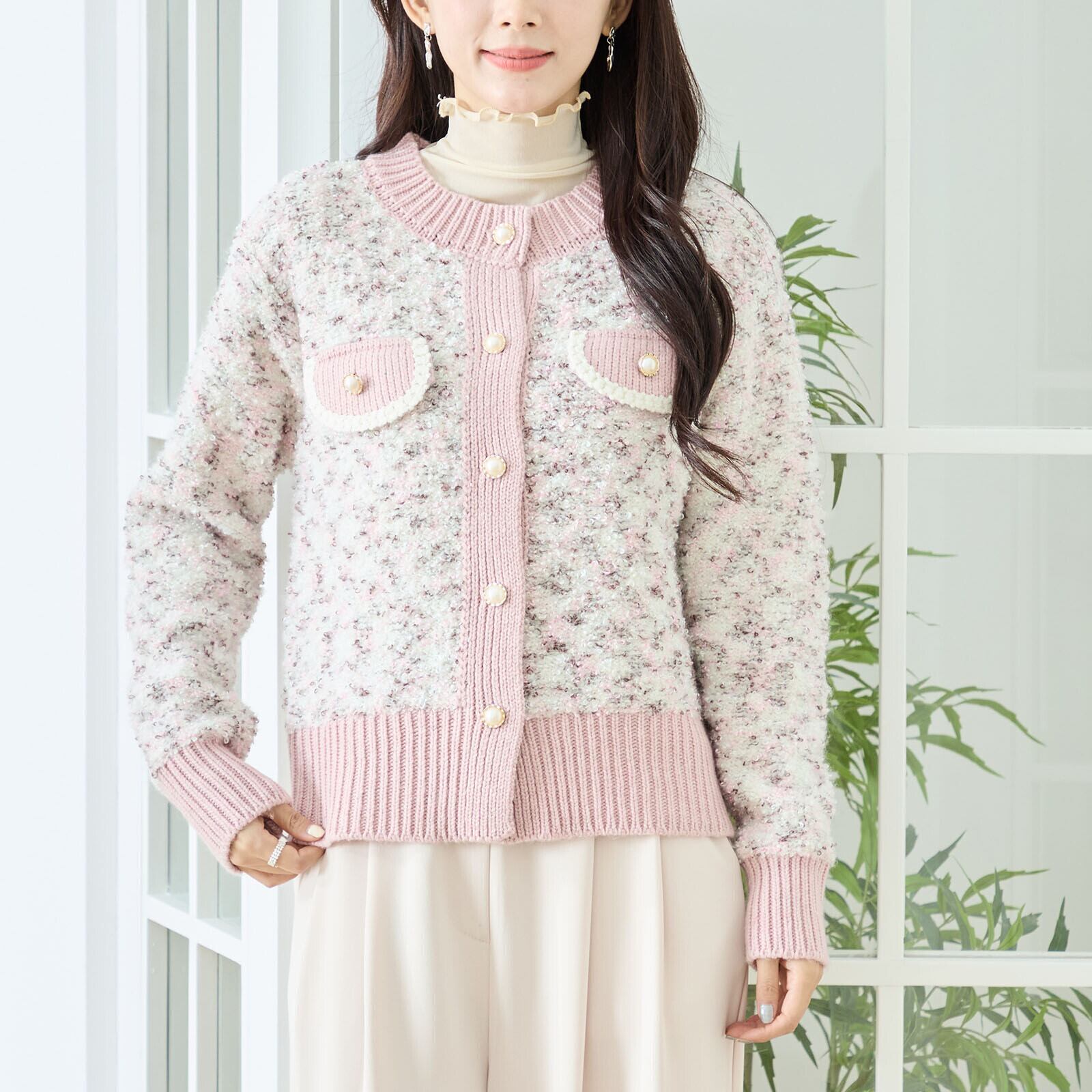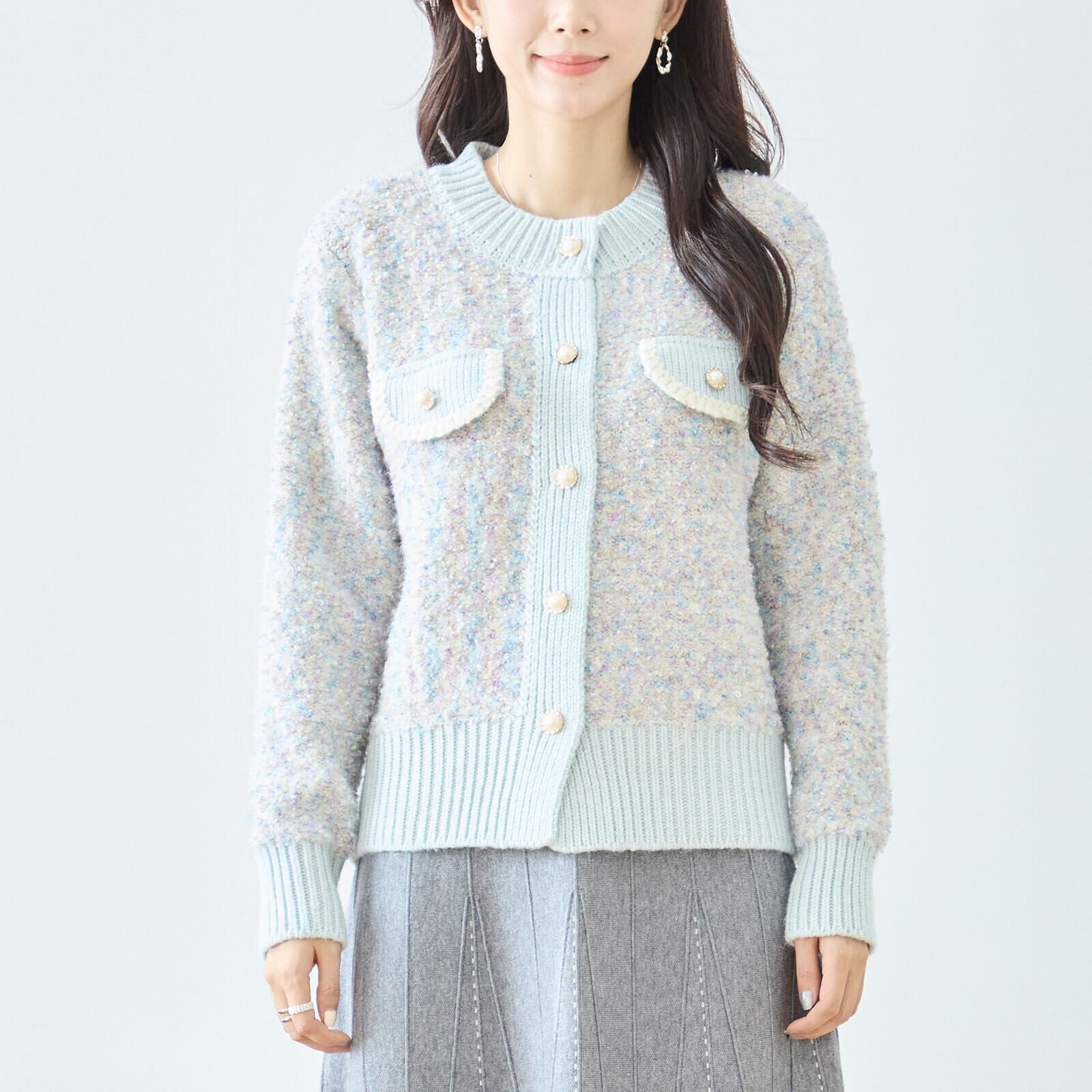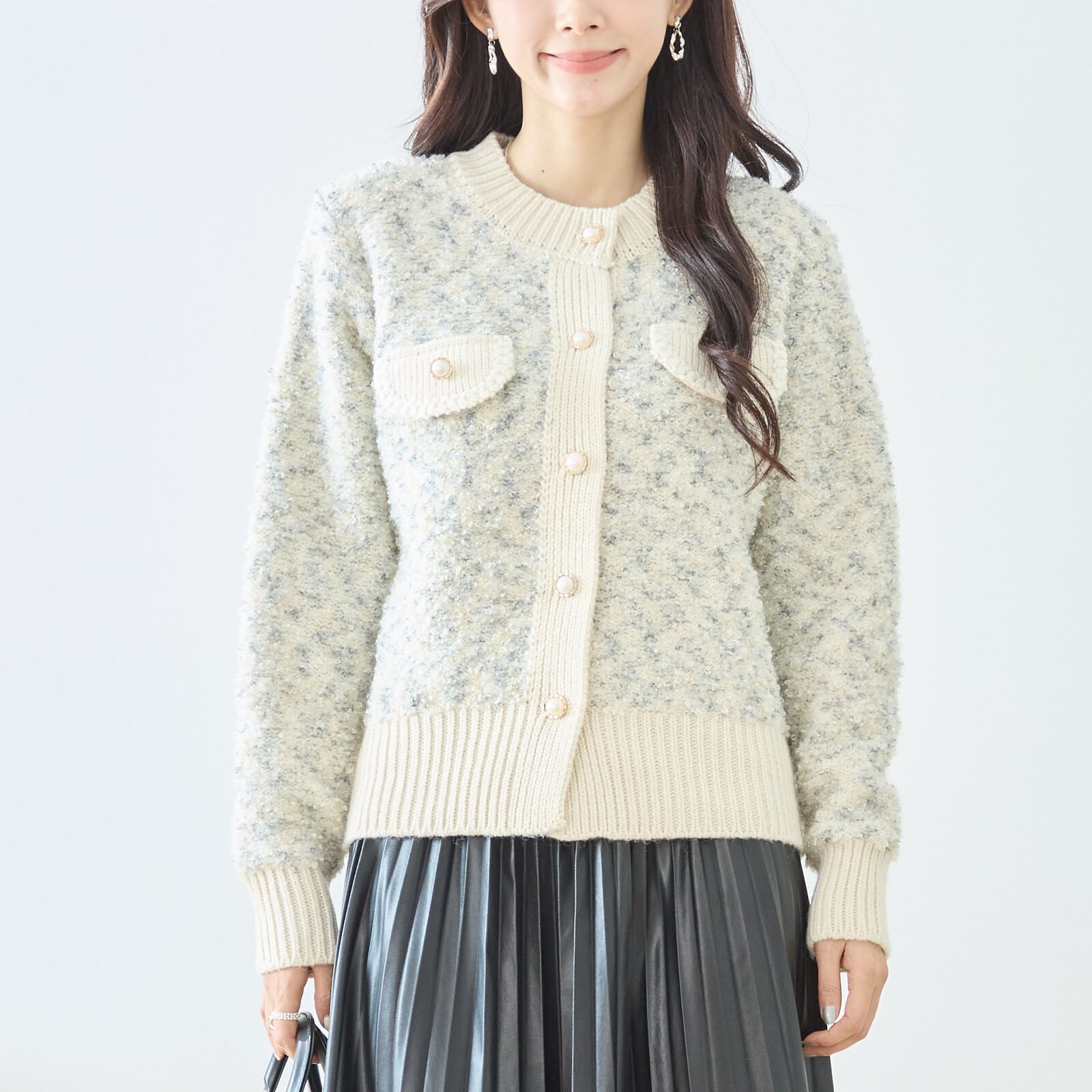 上品でフェミニンな印象を与えるツイード調ニットカーディガン。