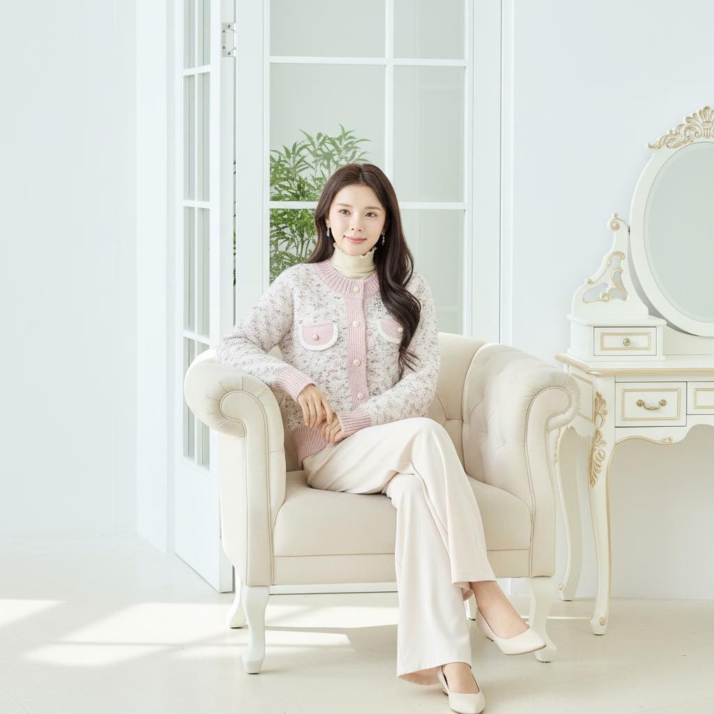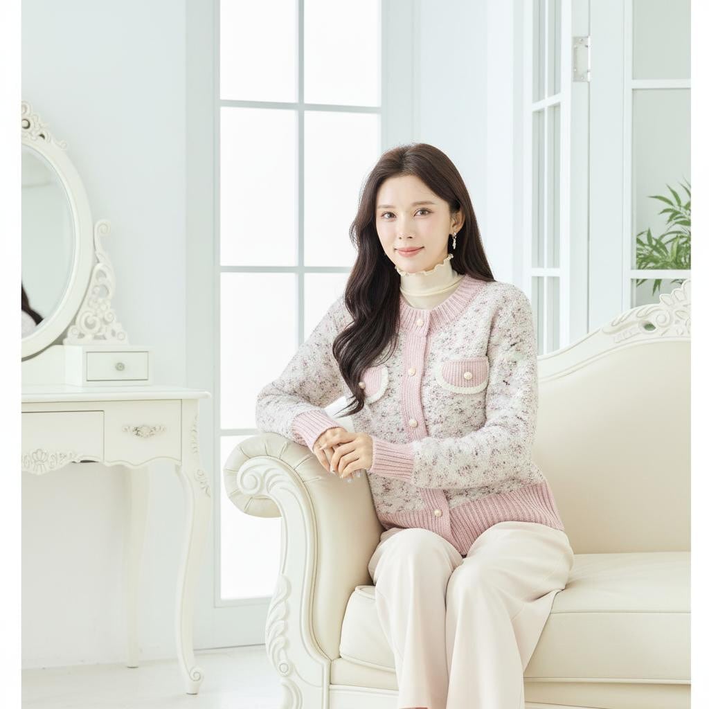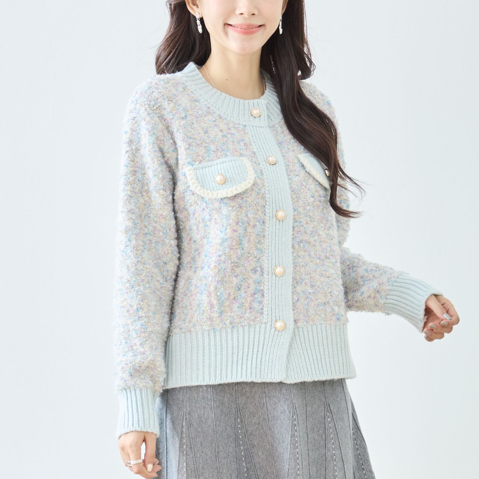 上品でフェミニンな印象を与えるツイード調ニットカーディガン。