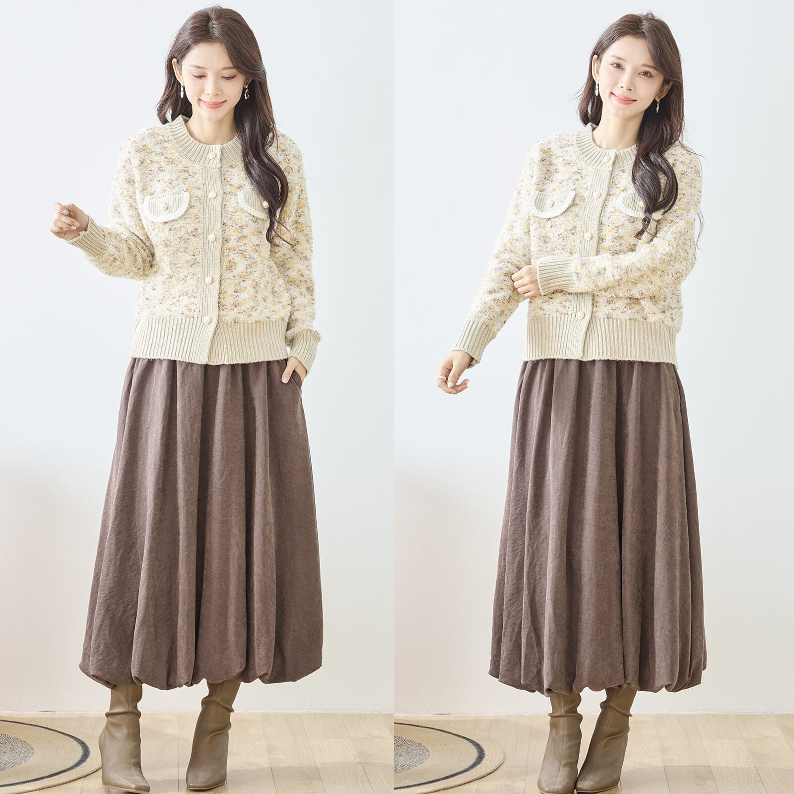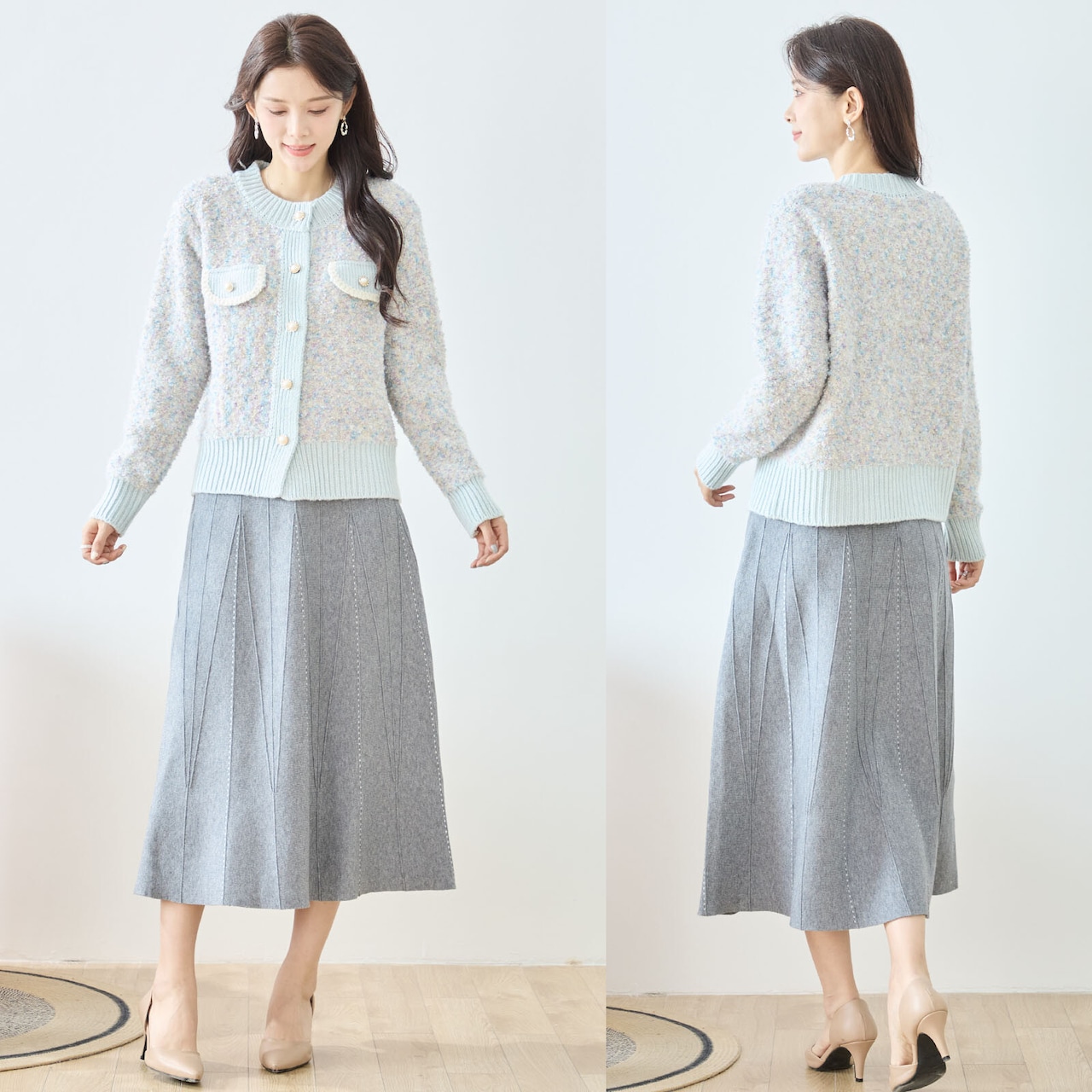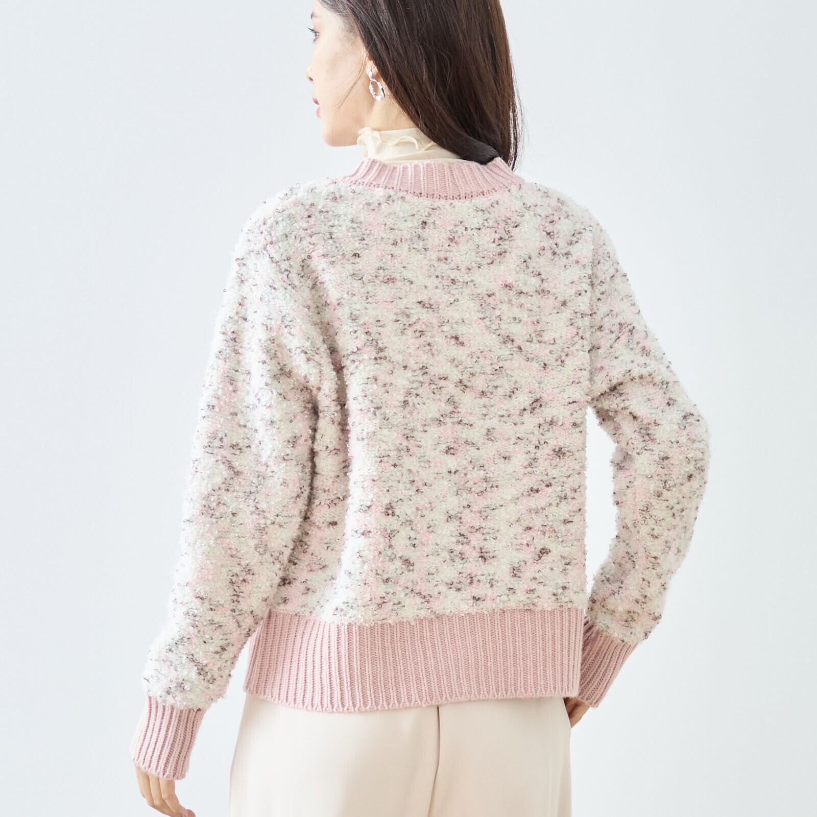 立体感のある編地と華やかなミックスカラーが、女性らしいやわらかな雰囲気を演出します。