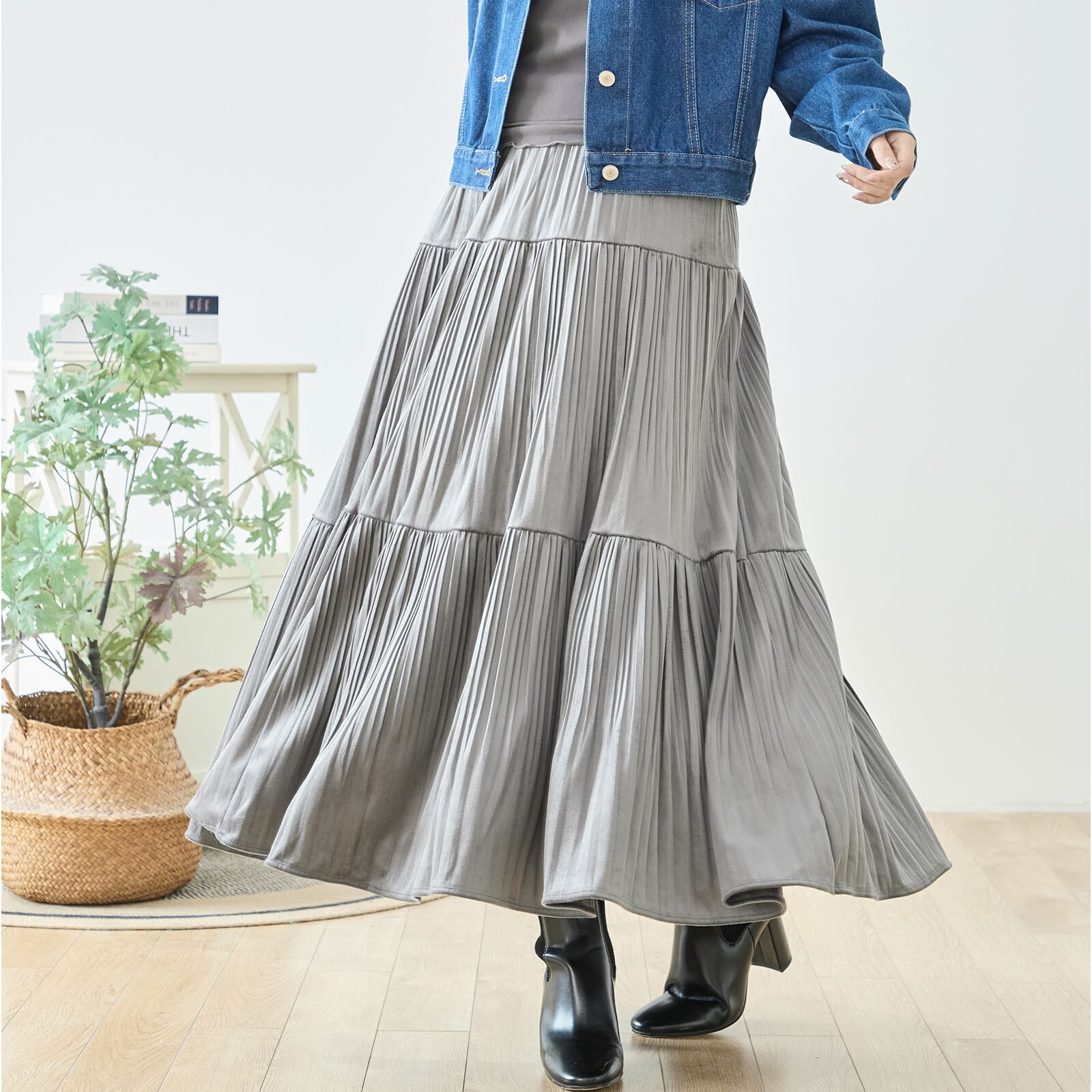 [Design]しなやかなベロア調の素材をたっぷり使用した、動くたびに揺れるエレガントなプリーツスカート。ボリューム感のあるフレアシルエットながら、縦のラインが美しく脚長効果も期待できます。ウエストゴムでストレスフリーな履き心地を実現し、トップスをインしてもアウトしてもサマになる万能デザイン。カジュアルからフェミニンまで、スタイリング次第で印象を変えられます。