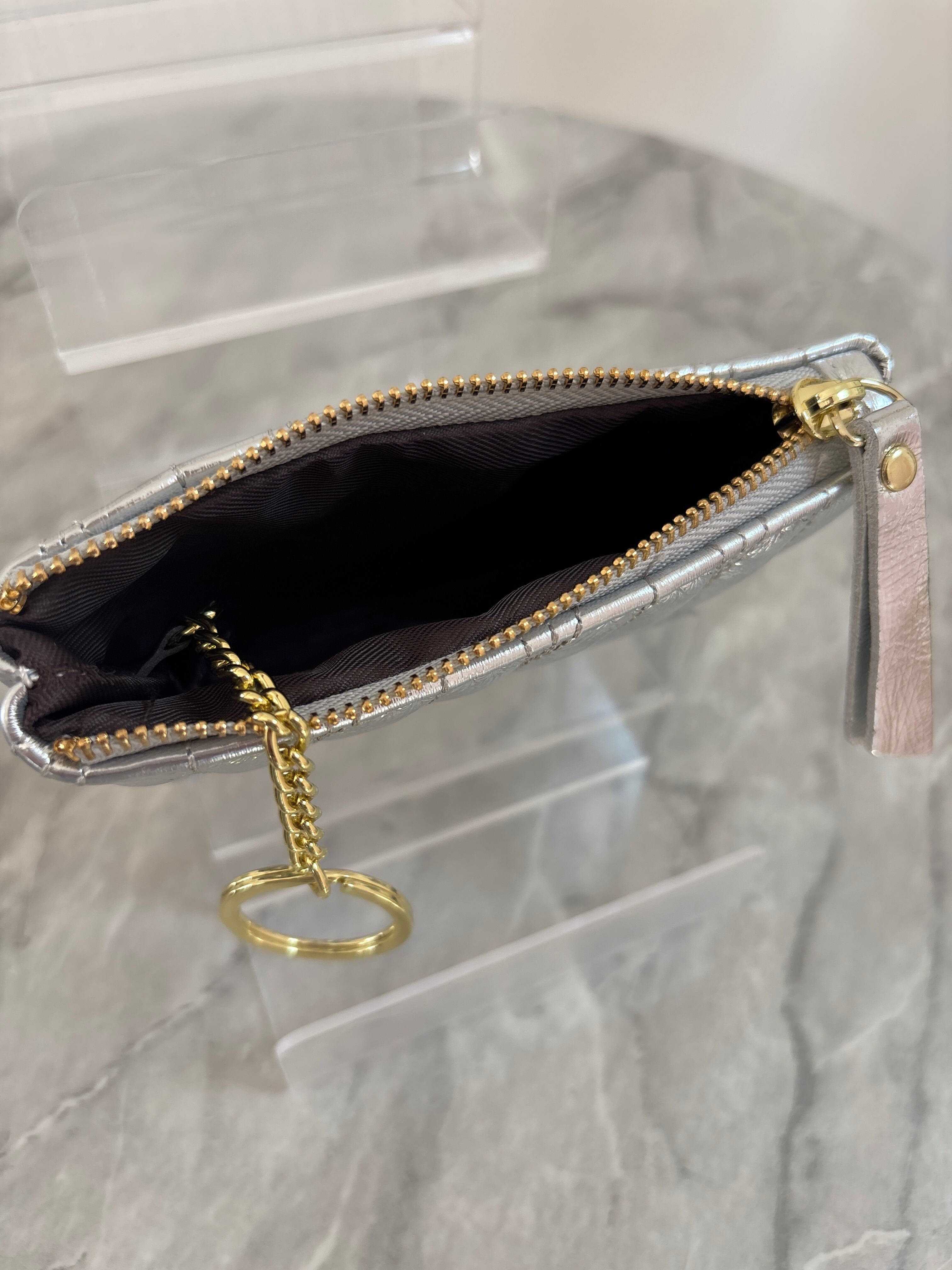 【S2とことこ】国内発送 K67.デザインシルバー ポーチ お素材牛革 サイズ13✖️10✖️5 ノーブランド カラーシルバー