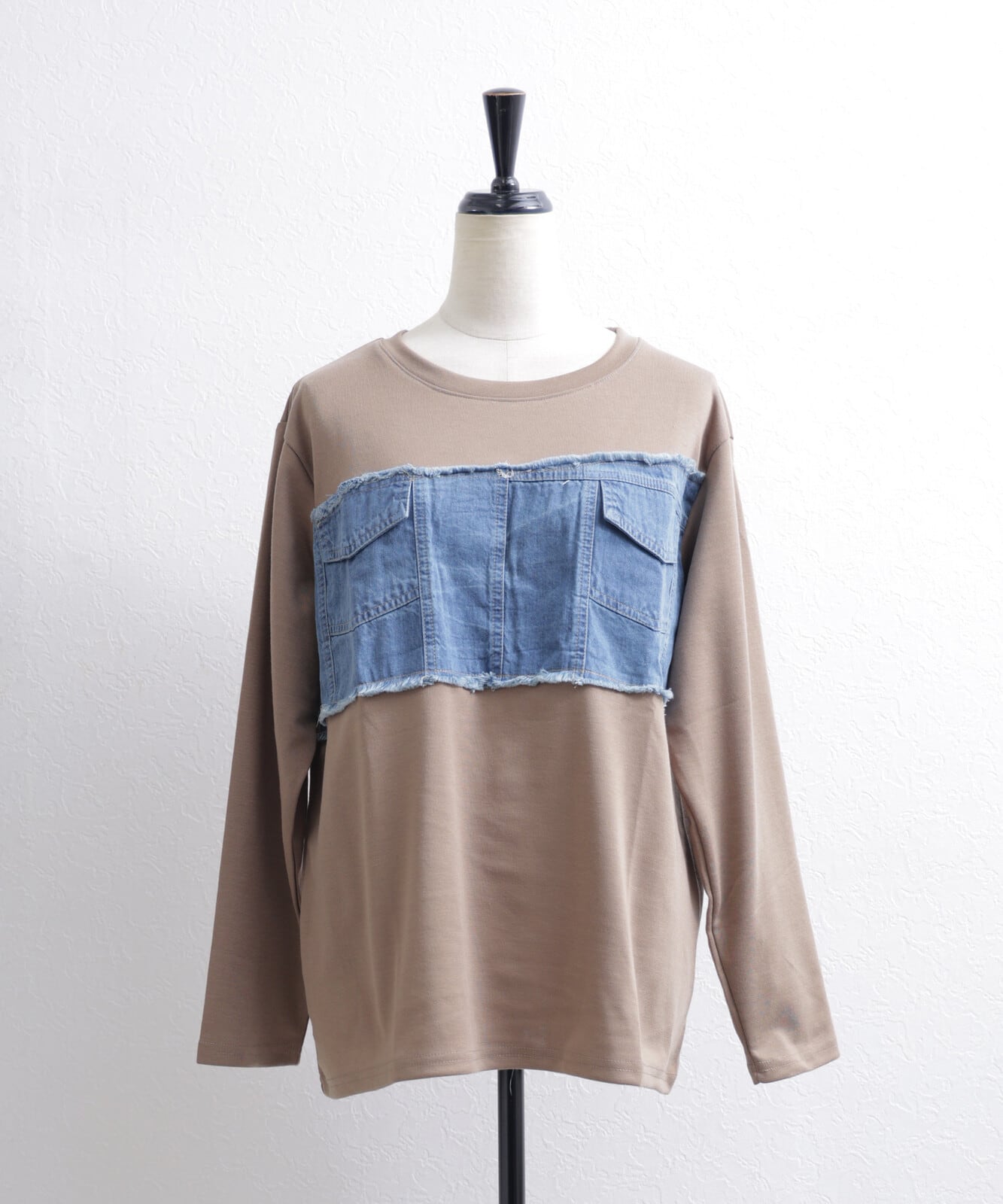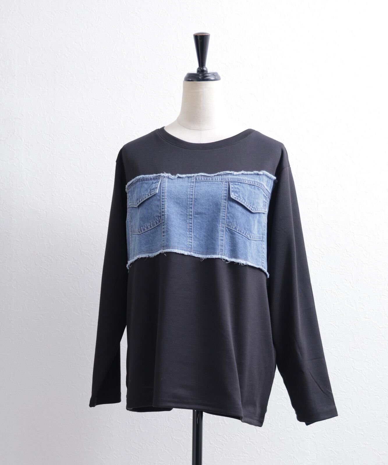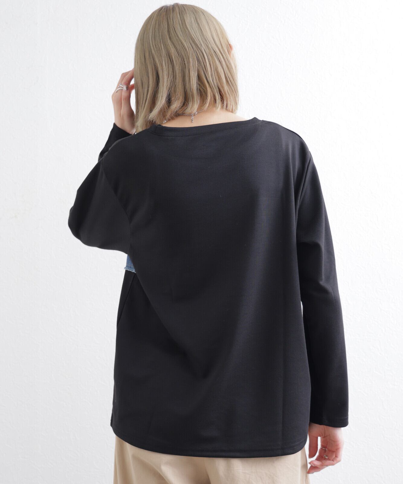 【 ディテール 】胸元のデニムの飾りポケットがかわいらしい印象のカットソートップス☆ゆったりとした着心地で、一枚でもさらっと着用いただけます。