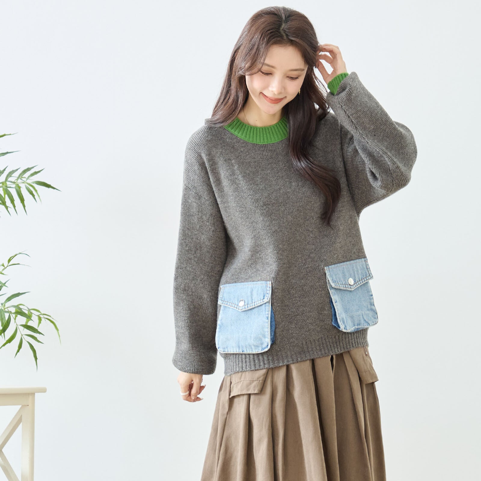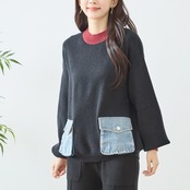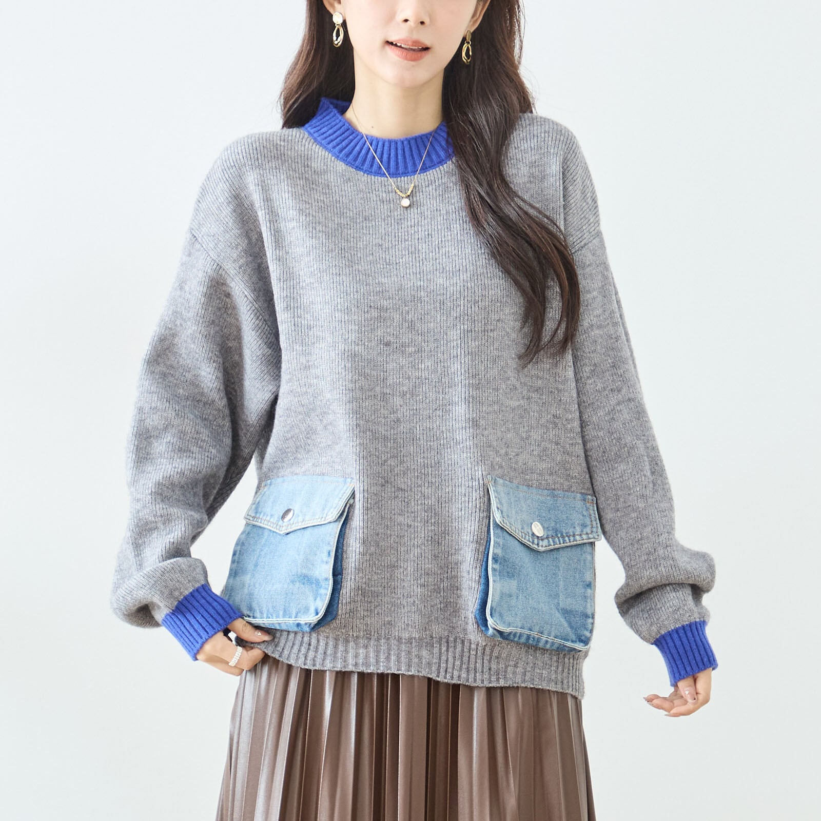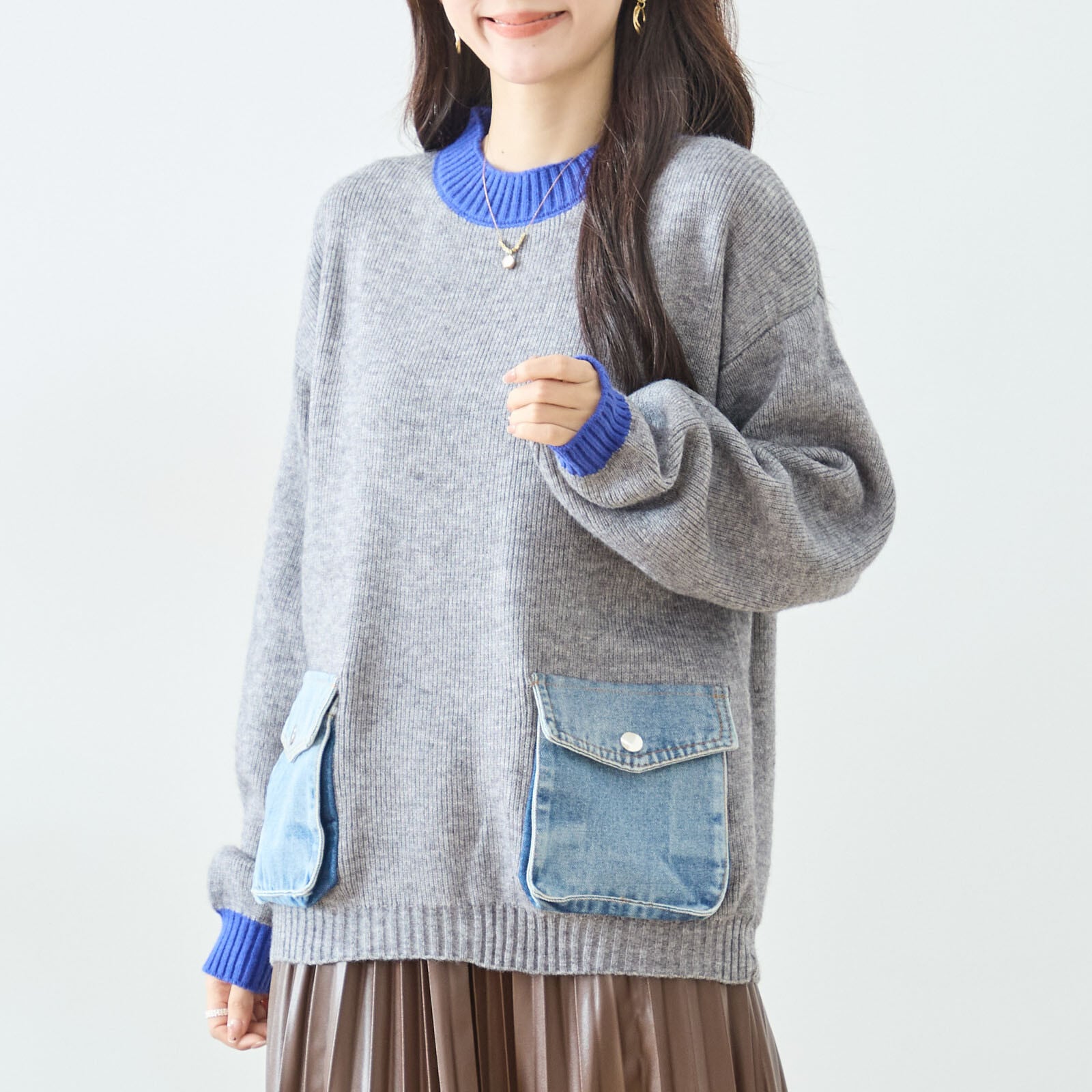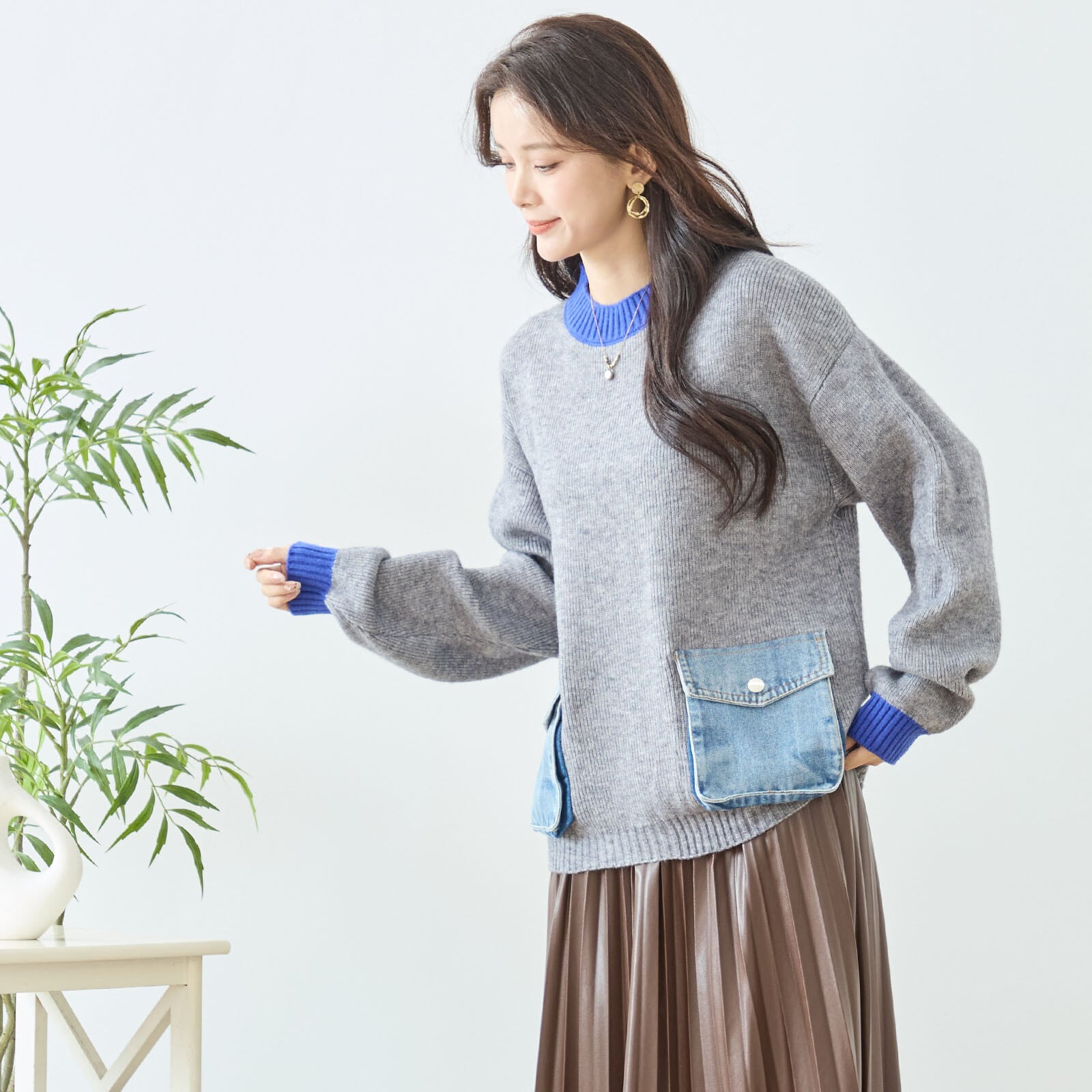 カジュアルなデニムポケットとバイカラーネックデザインが目を惹くニットプルオーバー。柔らかなニット素材を使用し、程よいゆったり感で快適な着心地を実現しました。