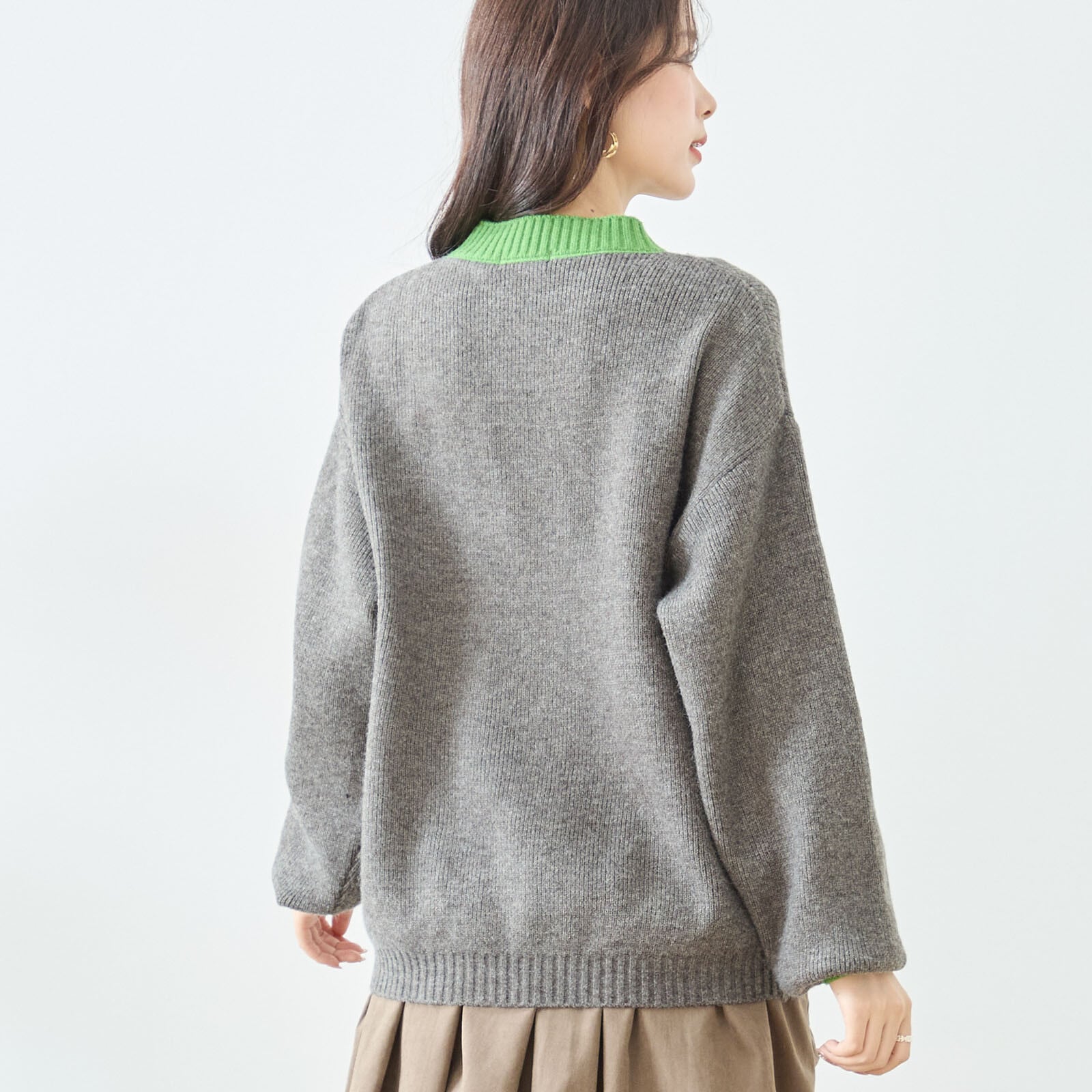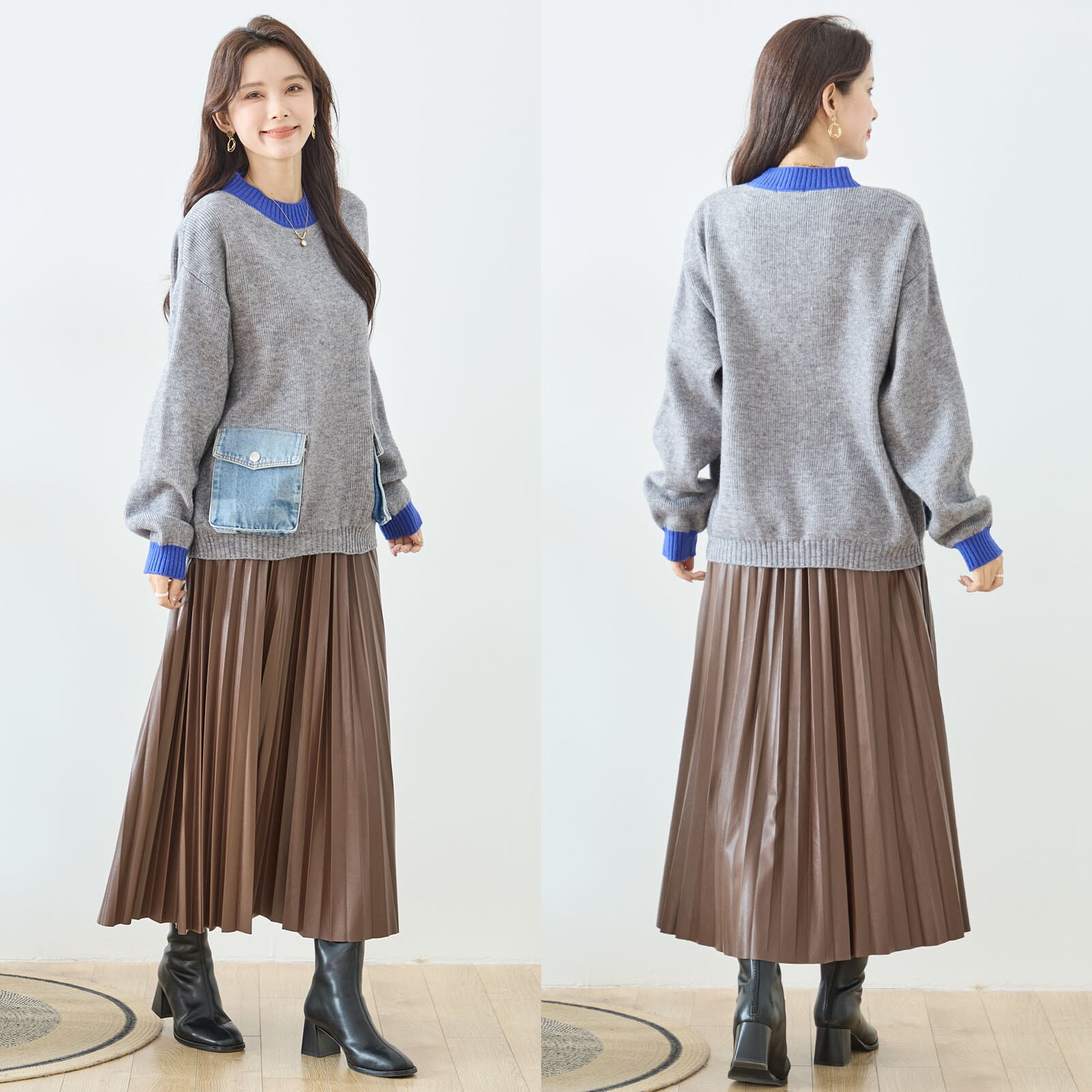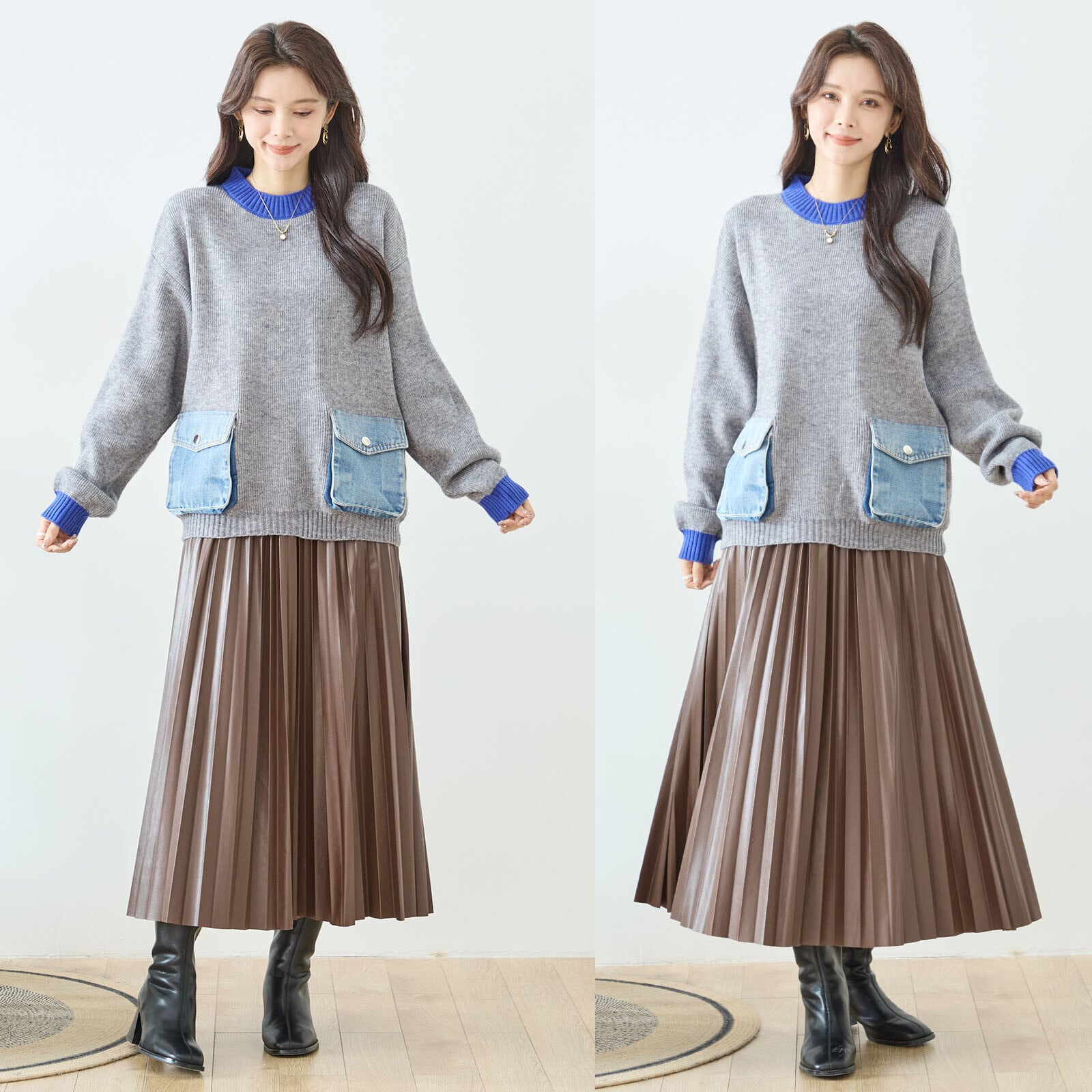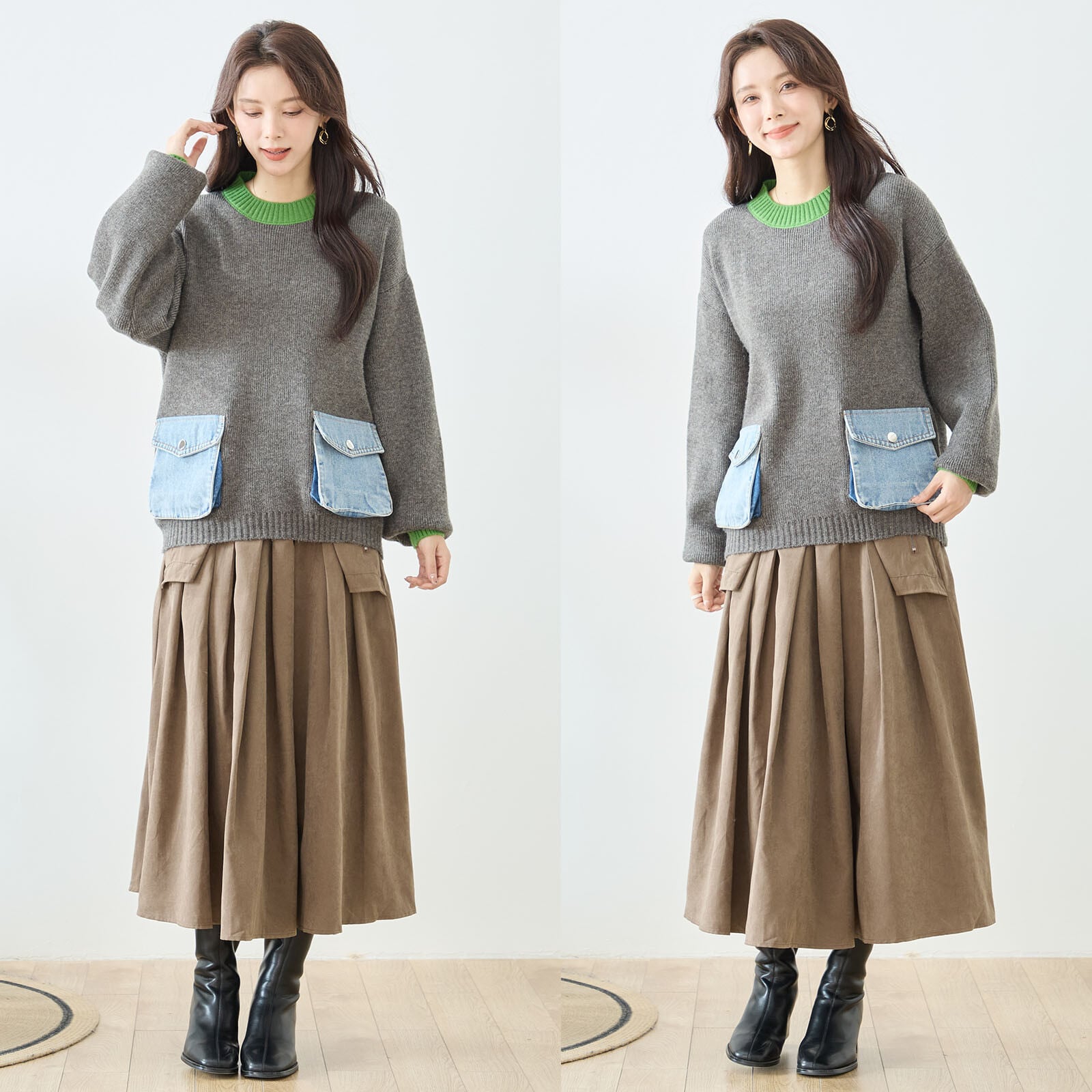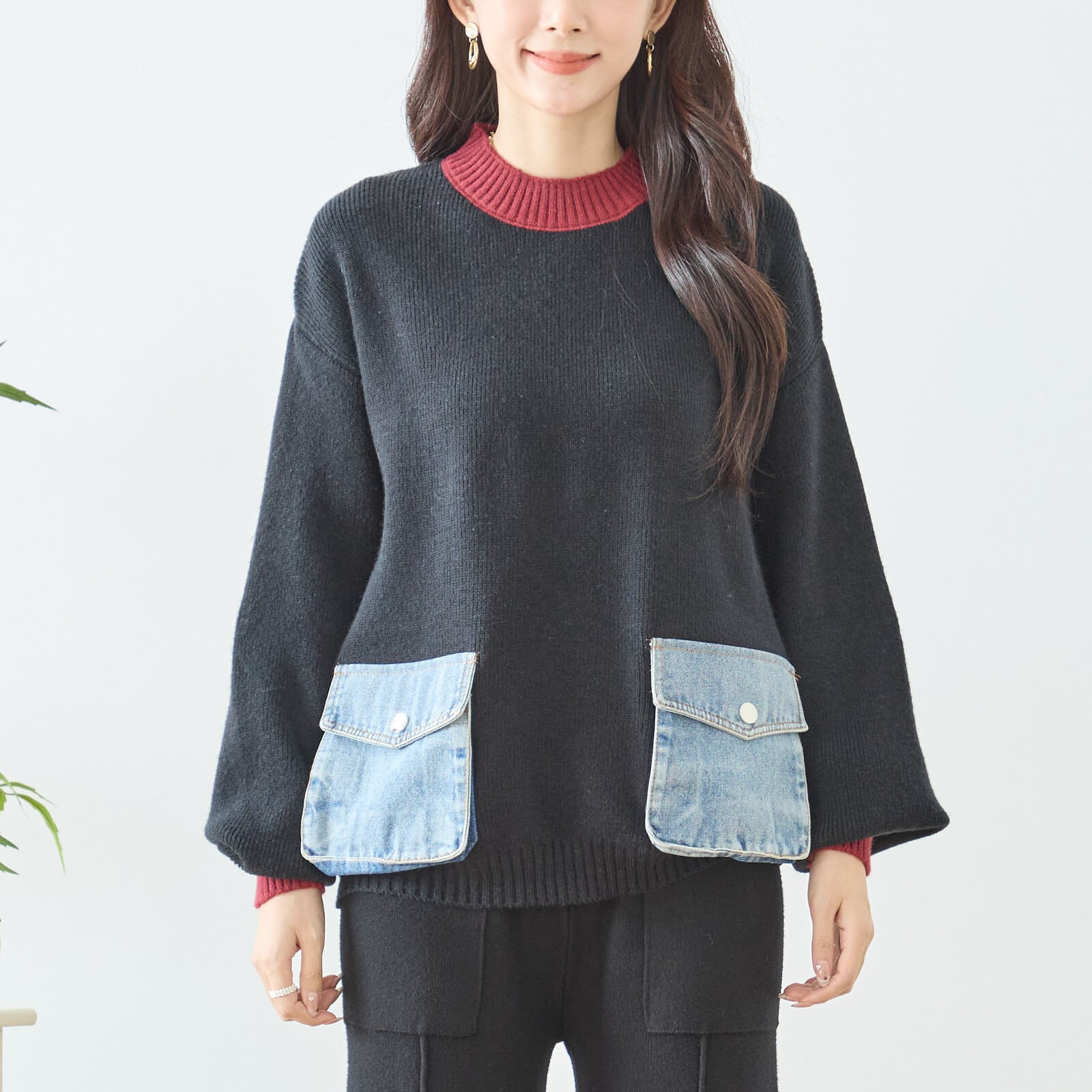 カジュアルなデニムポケットとバイカラーネックデザインが目を惹くニットプルオーバー。柔らかなニット素材を使用し、程よいゆったり感で快適な着心地を実現しました。