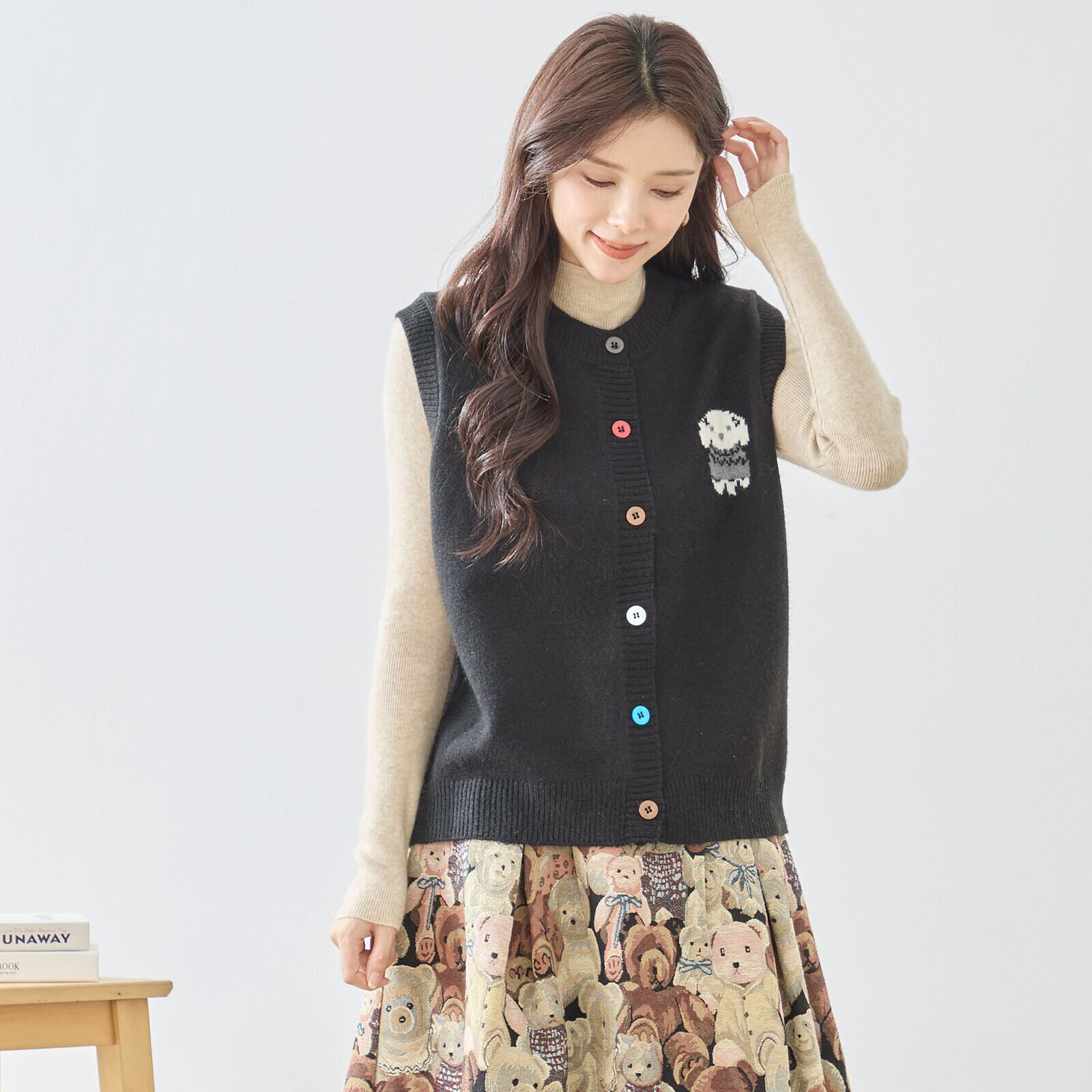 胸元にあしらわれた犬のモチーフが愛らしい、遊び心あるニットベスト。個性的なマルチカラーボタンがアクセントになり、シンプルなコーディネートに華やぎをプラスします。シャツやブラウスとのレイヤードにも映えるデザインで、秋冬のスタイリングに温かみを添えてくれる一枚です。