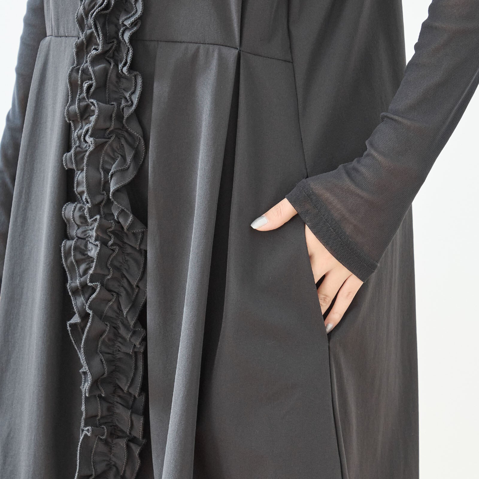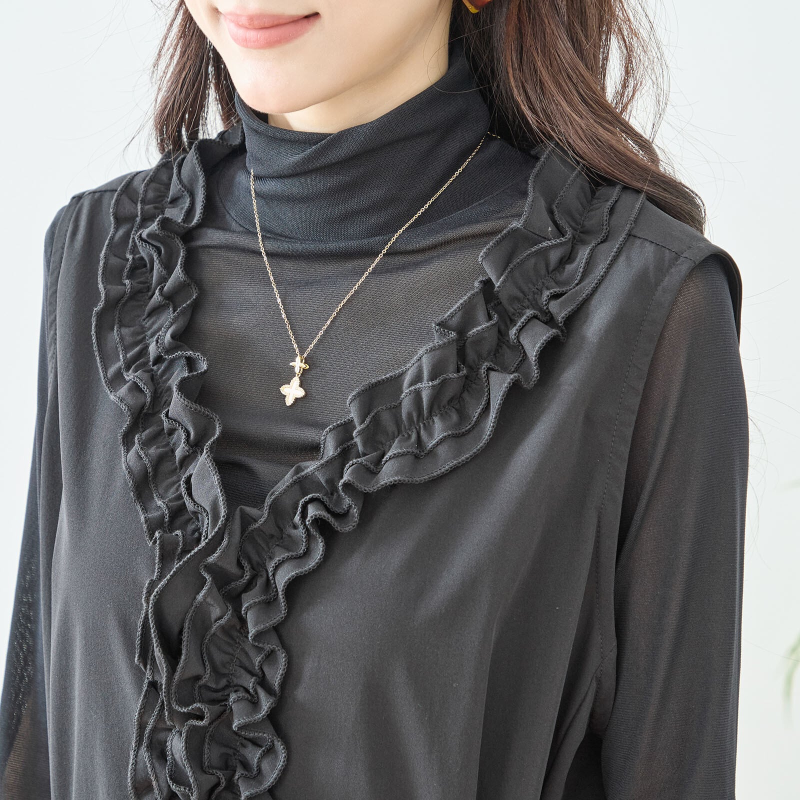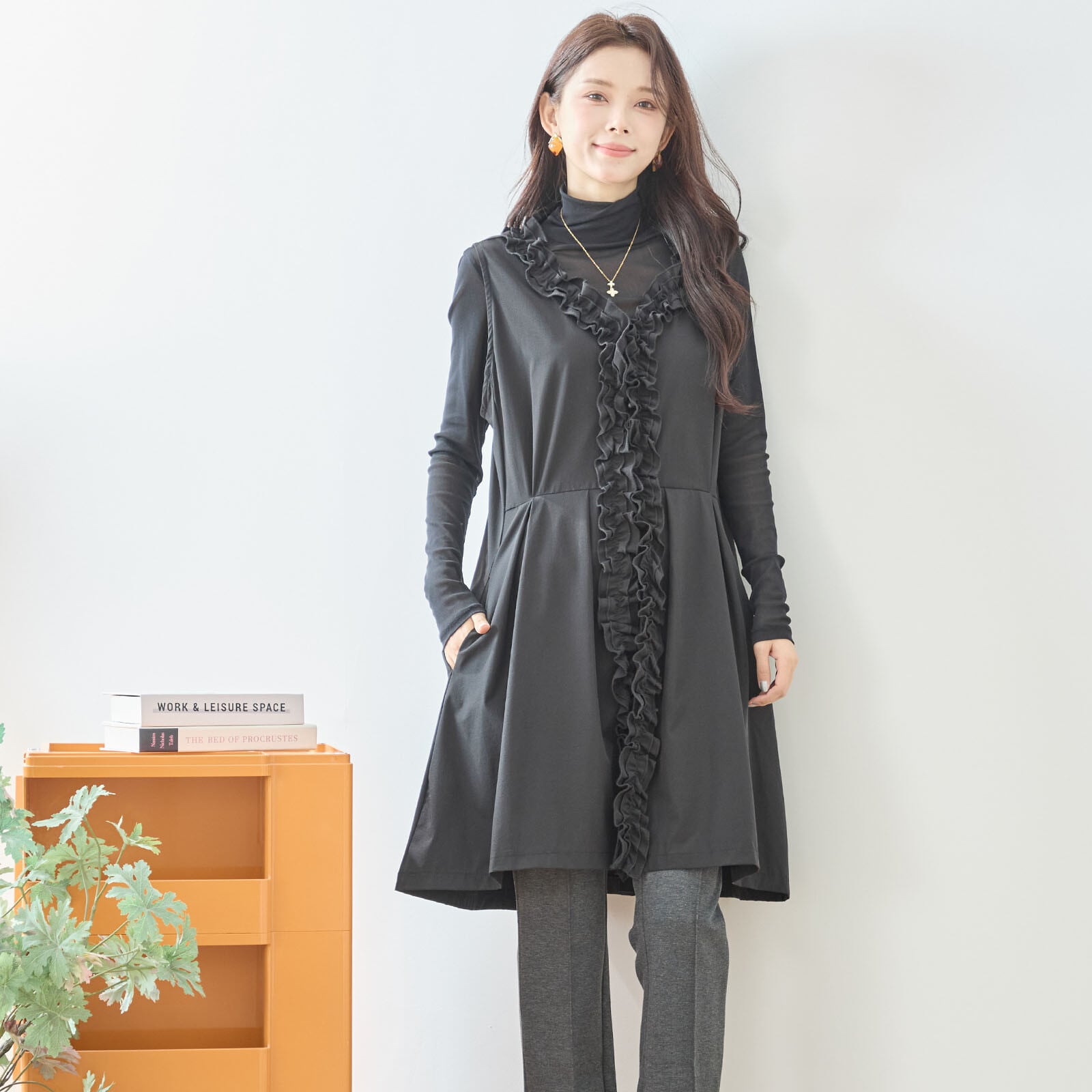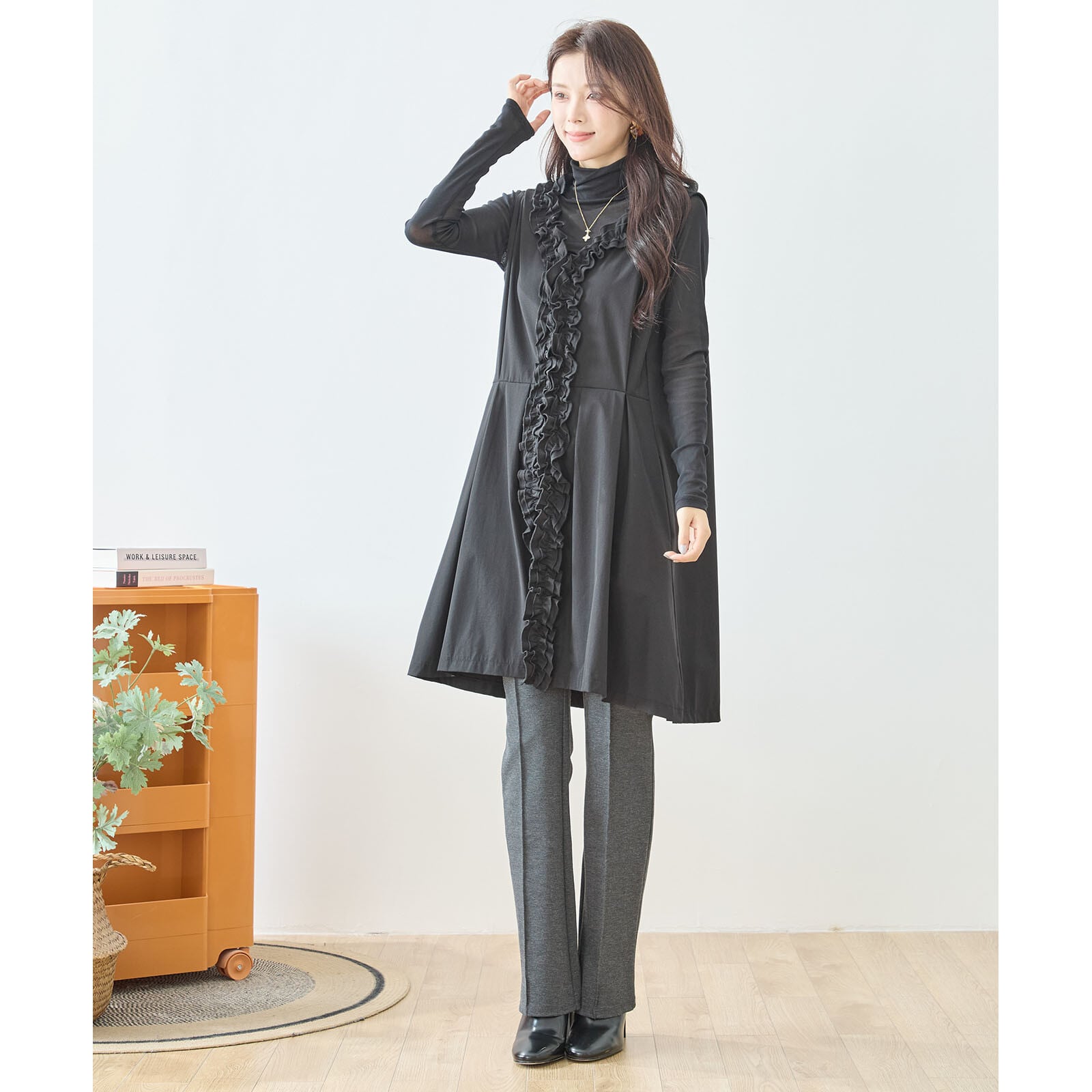 胸元から裾にかけて施された立体的なフリルが華やかな印象を与えるロングベスト。女性らしい抜け感を演出します。フロントは隠しボタン仕様で、きれいめにもカジュアルにも合わせやすいデザイン。便利なサイドポケット付きで機能性も◎。ワンピース風に着たり、パンツと合わせたレイヤードスタイルにもおすすめです。