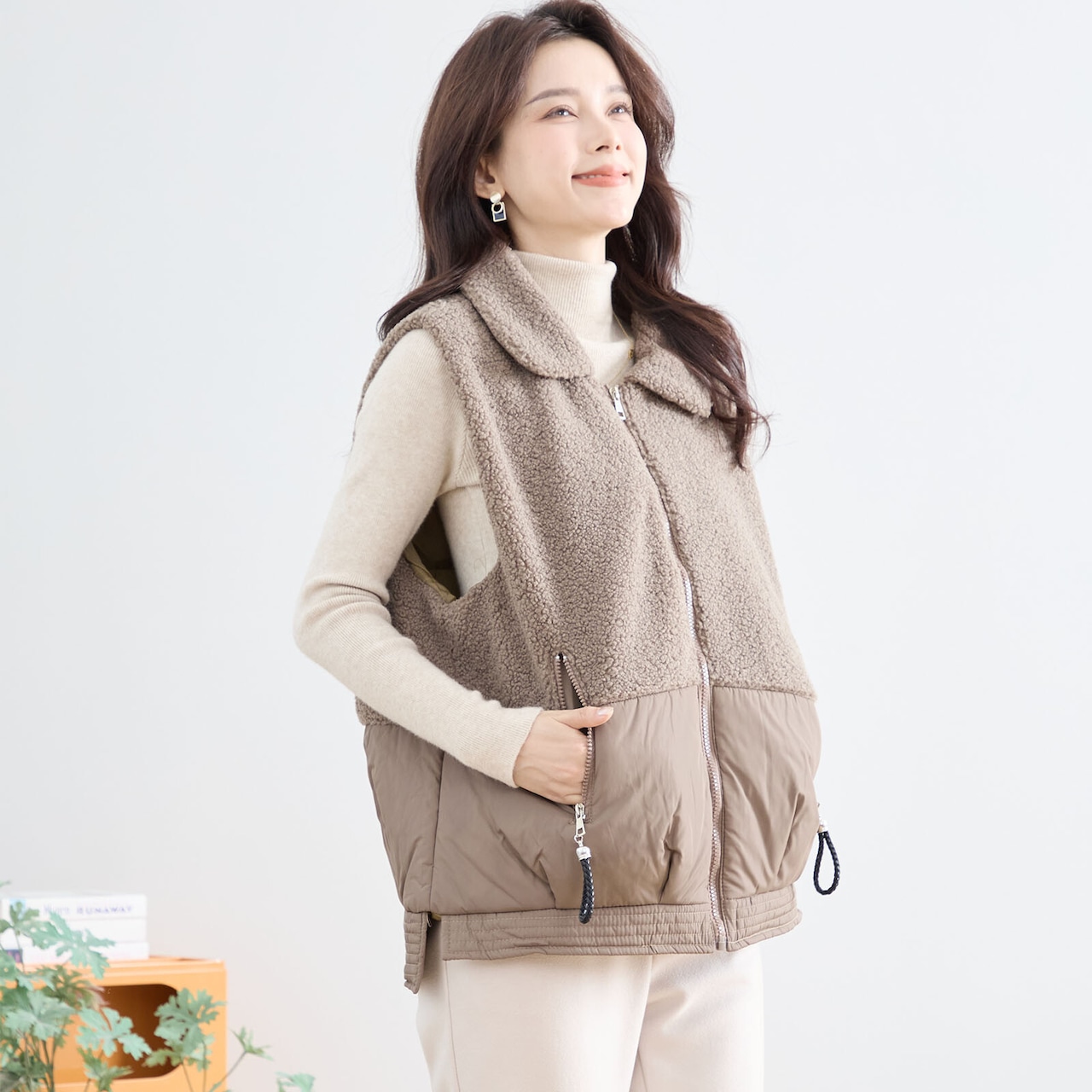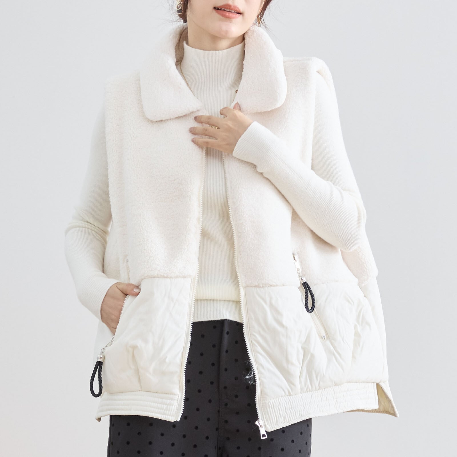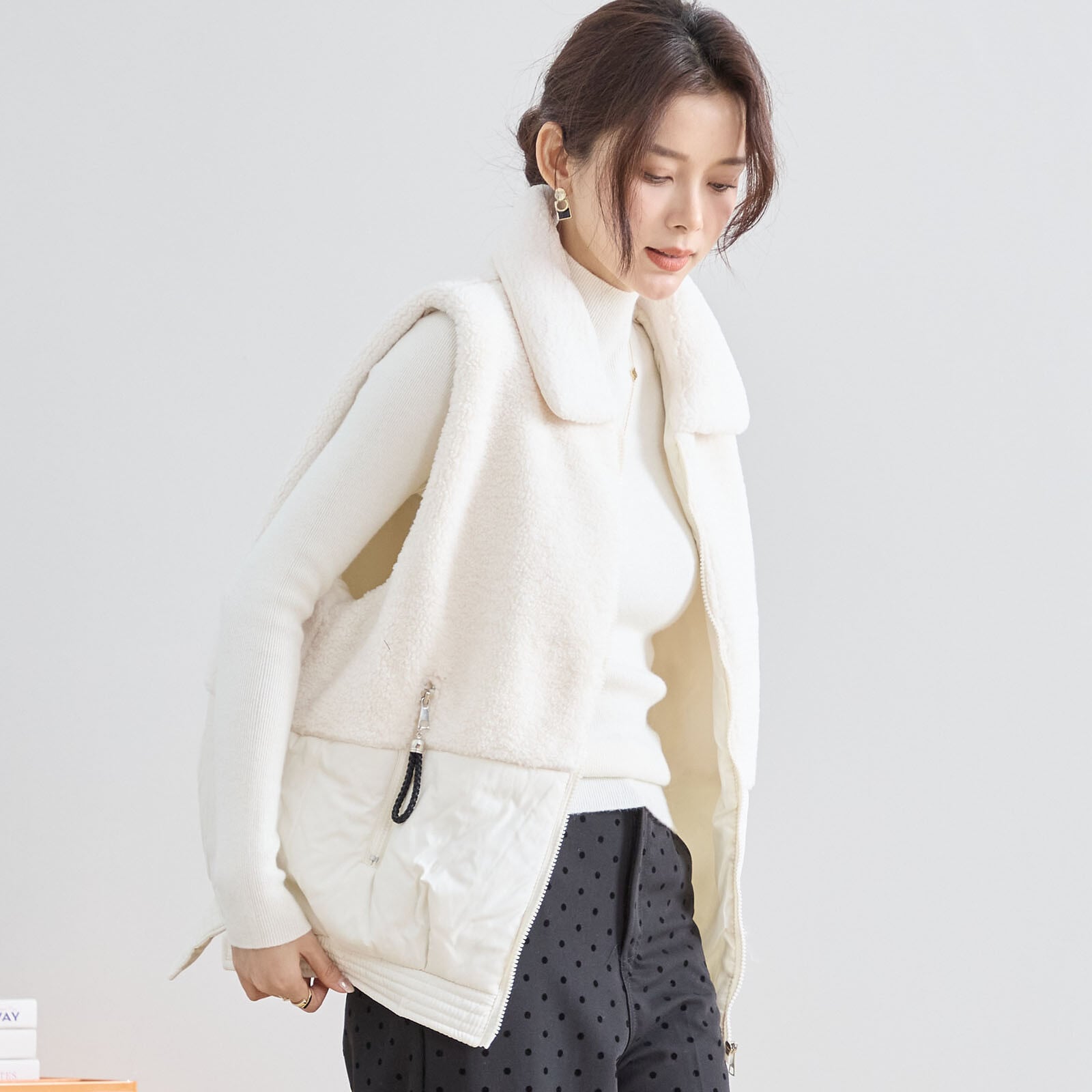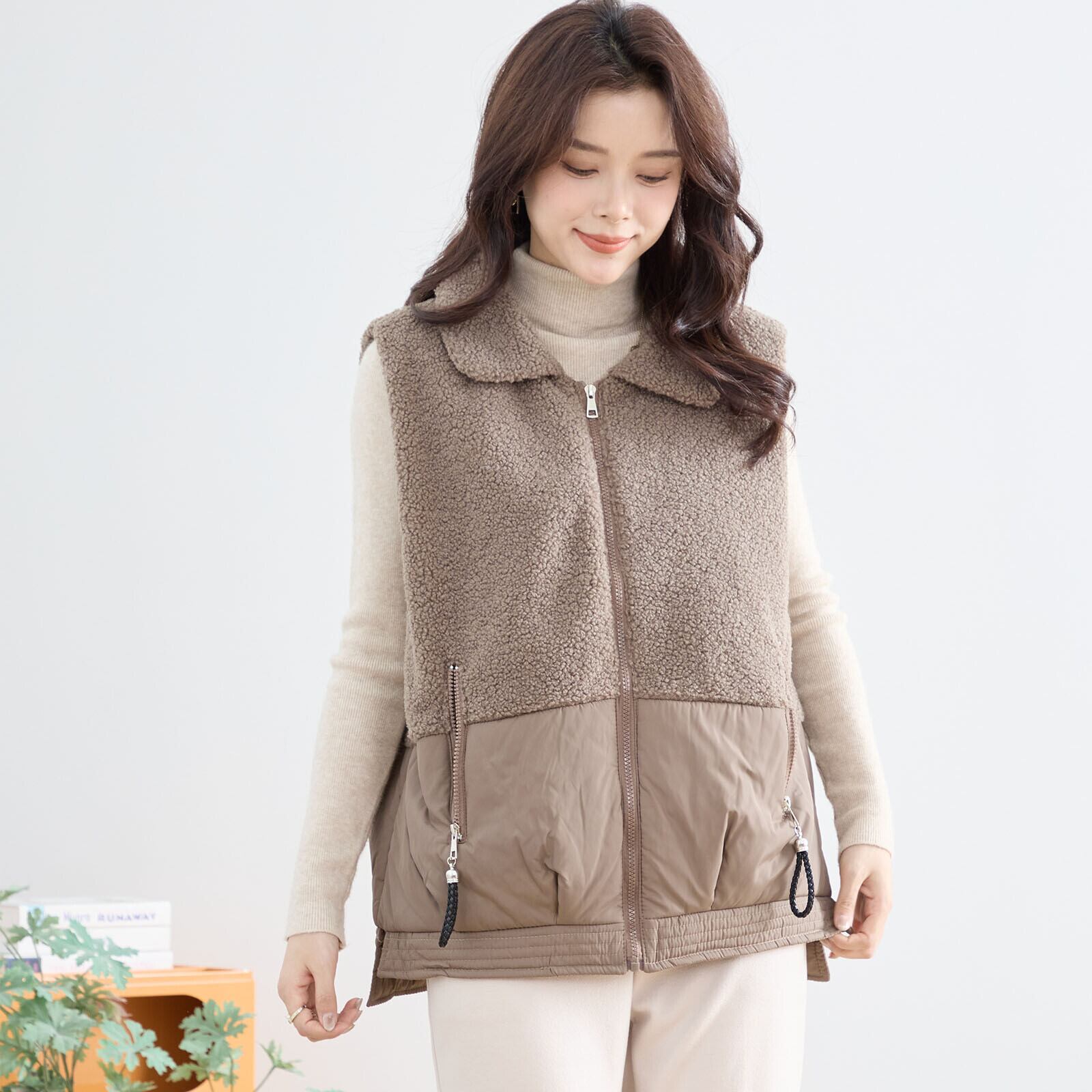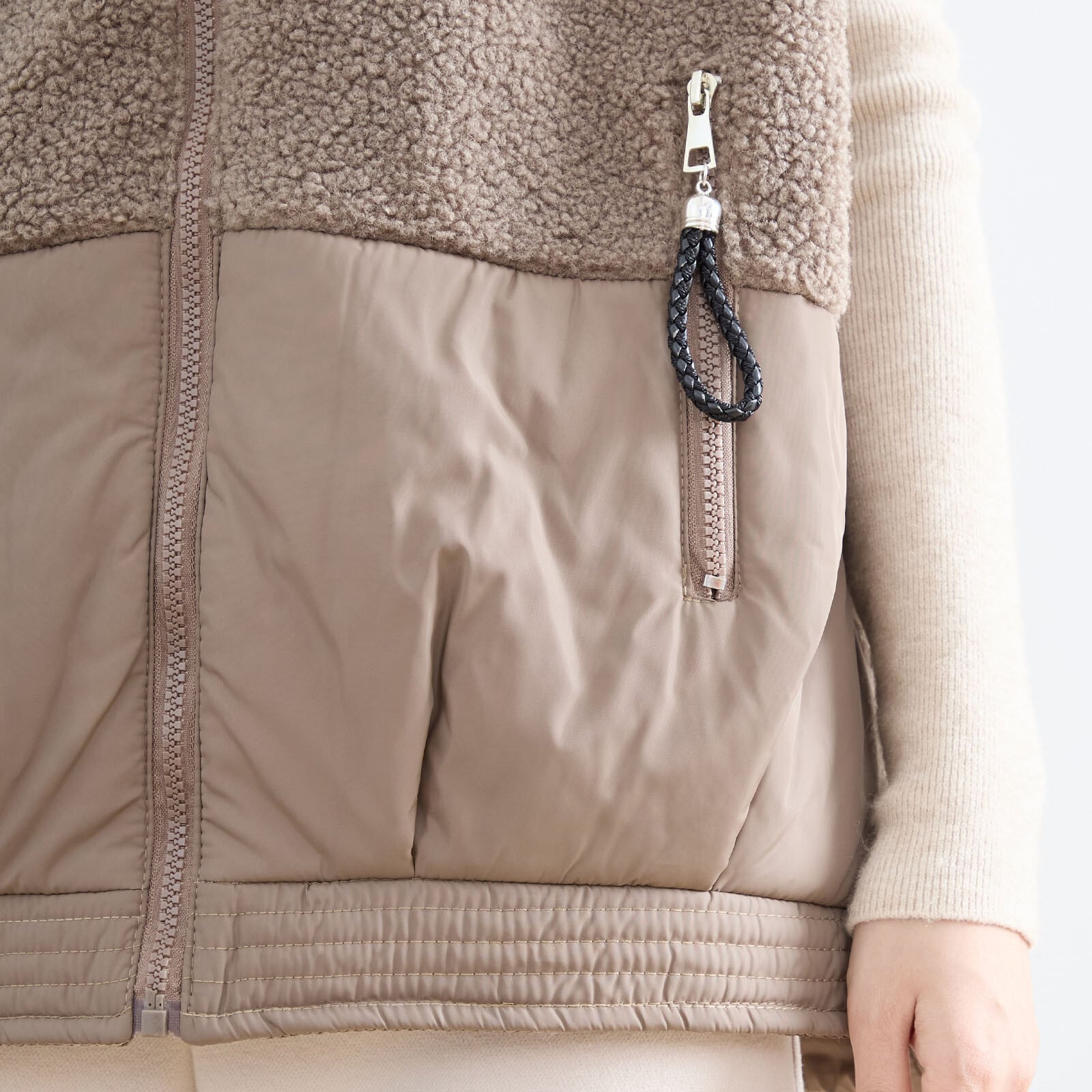 [Design]ボア素材切り替えのデザインが魅力のジップアップベスト。軽量でありながらも保温性に優れ、肌寒い季節のレイヤードスタイルにぴったりのアイテムです。異素材の組み合わせが立体感を生み出し、カジュアルながらもおしゃれな印象に。ポケット口のタッセル使いも目を引くオシャレなデザインです。