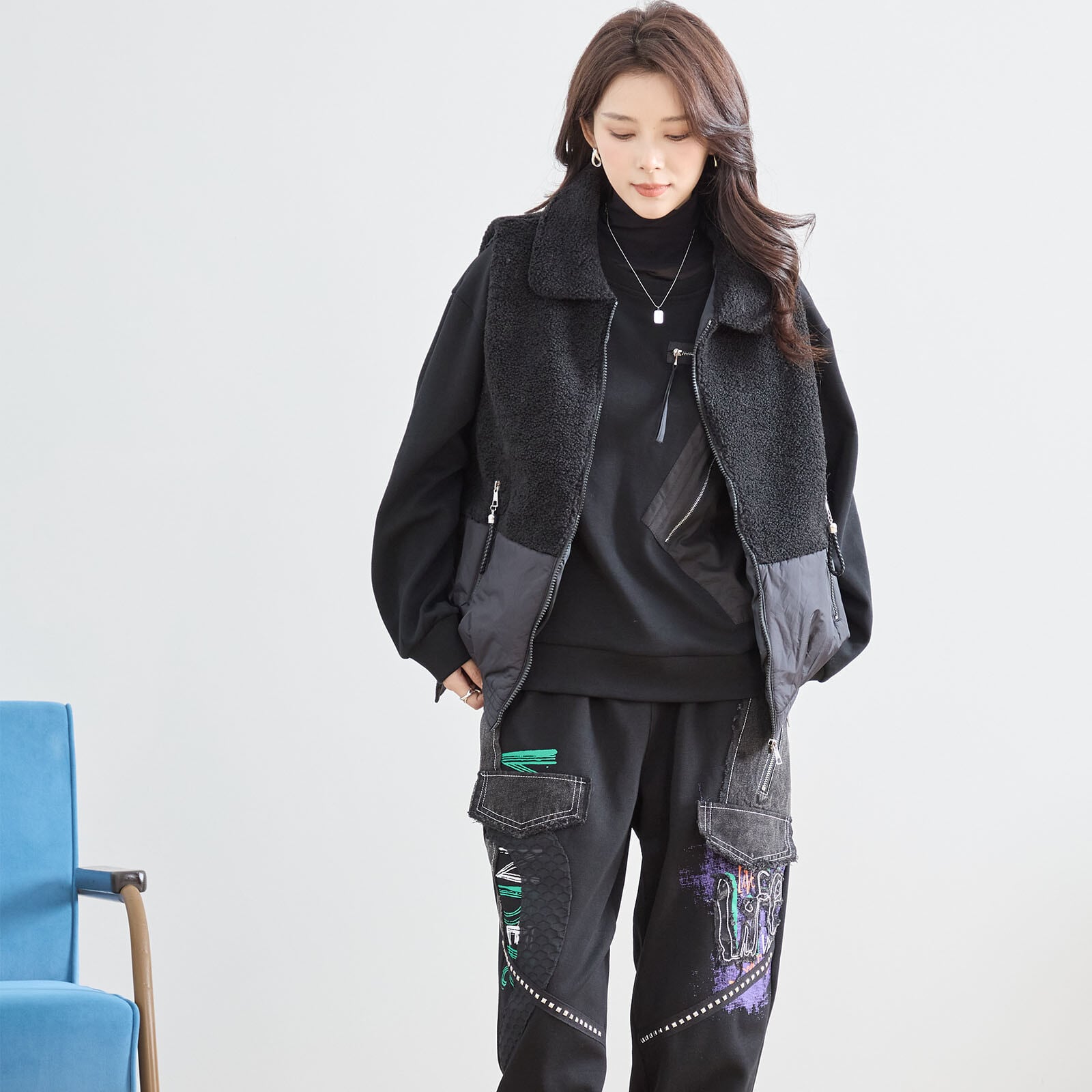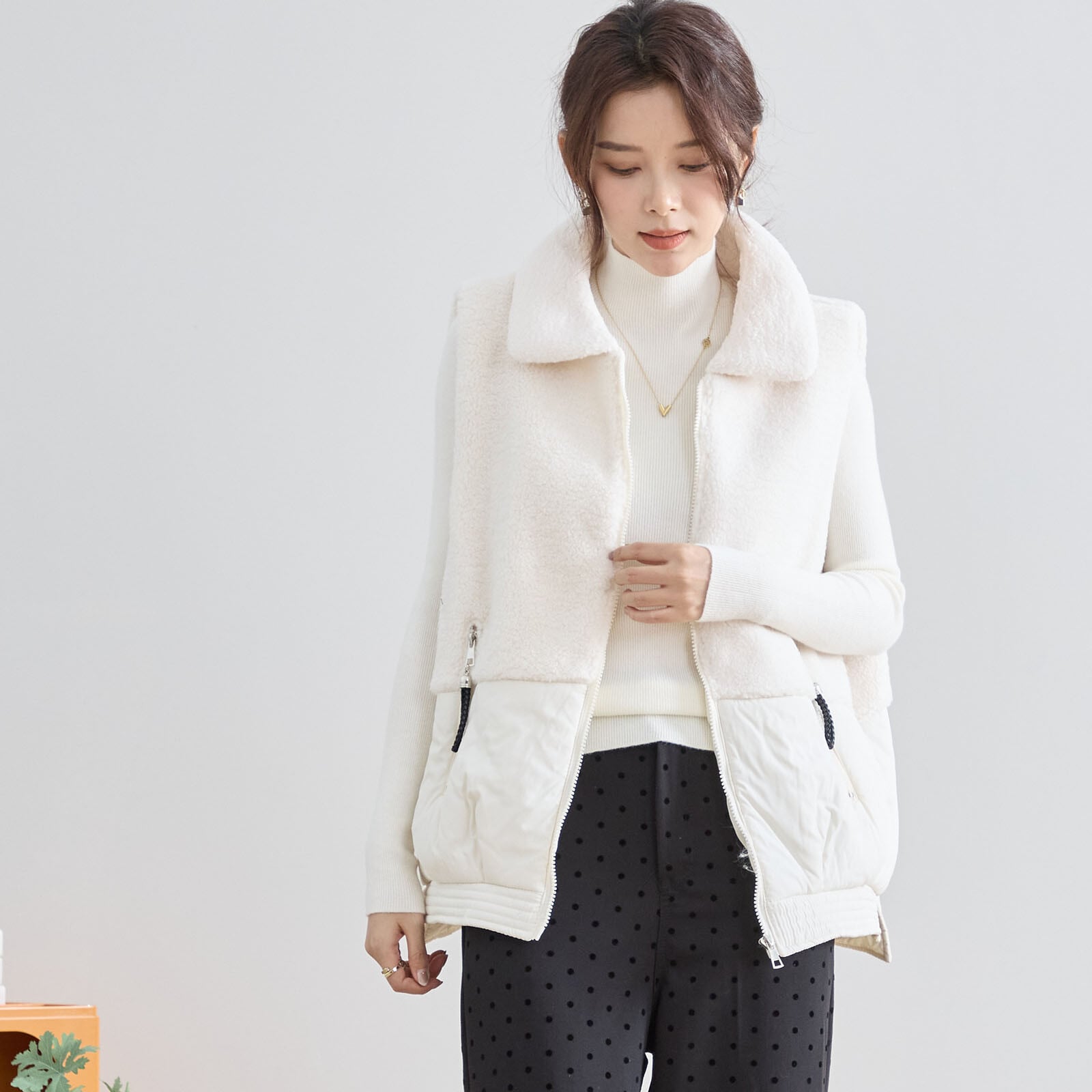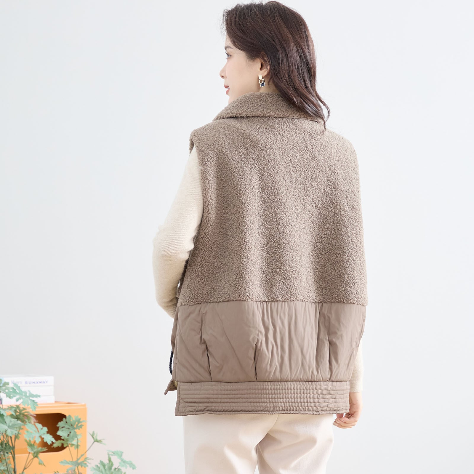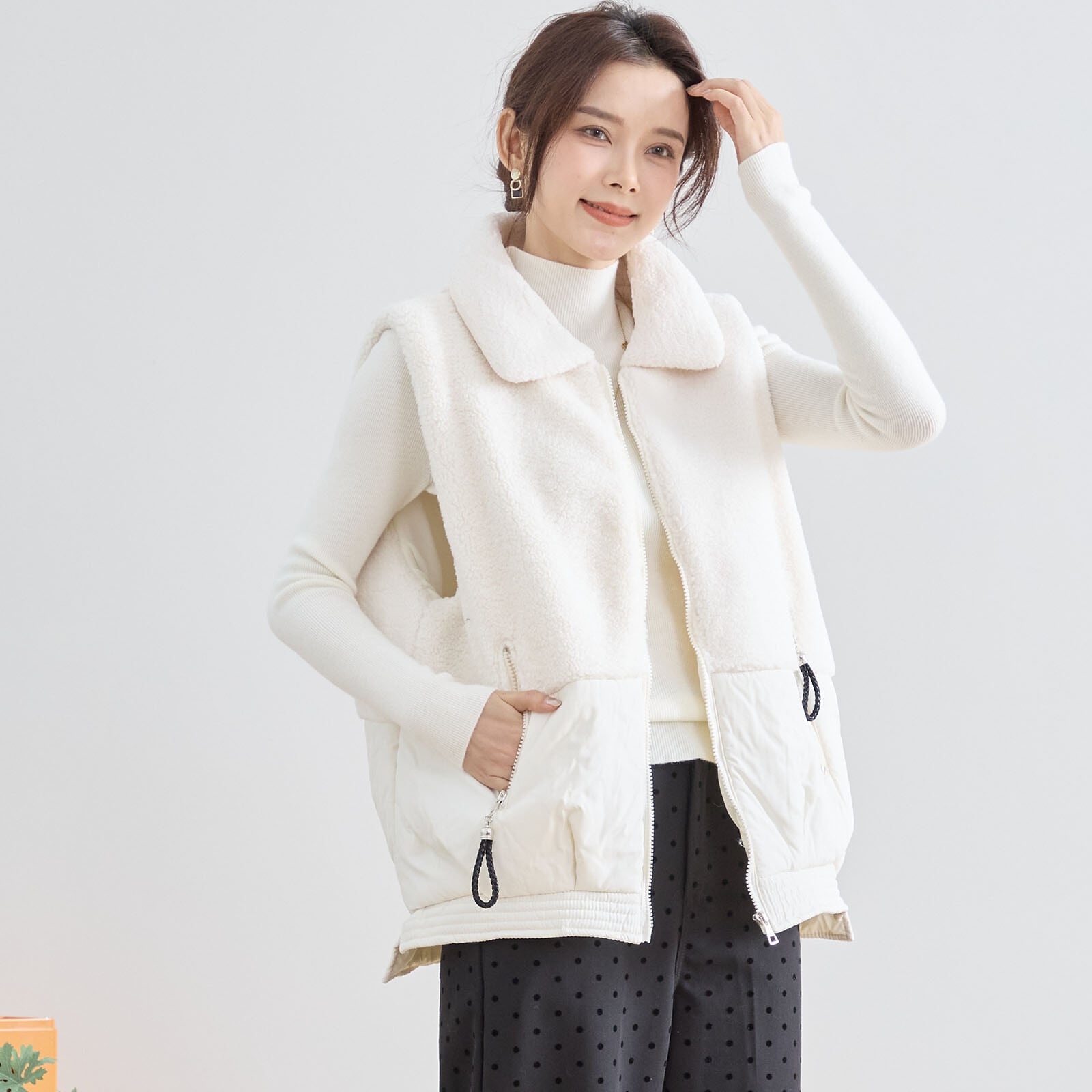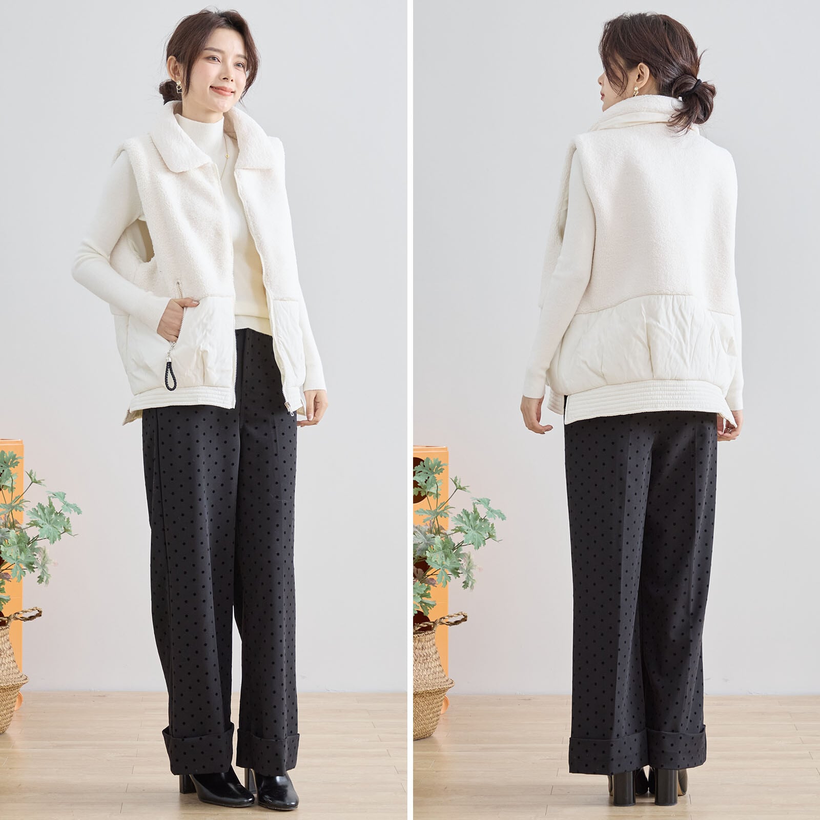 [Design]ボア素材切り替えのデザインが魅力のジップアップベスト。軽量でありながらも保温性に優れ、肌寒い季節のレイヤードスタイルにぴったりのアイテムです。異素材の組み合わせが立体感を生み出し、カジュアルながらもおしゃれな印象に。ポケット口のタッセル使いも目を引くオシャレなデザインです。