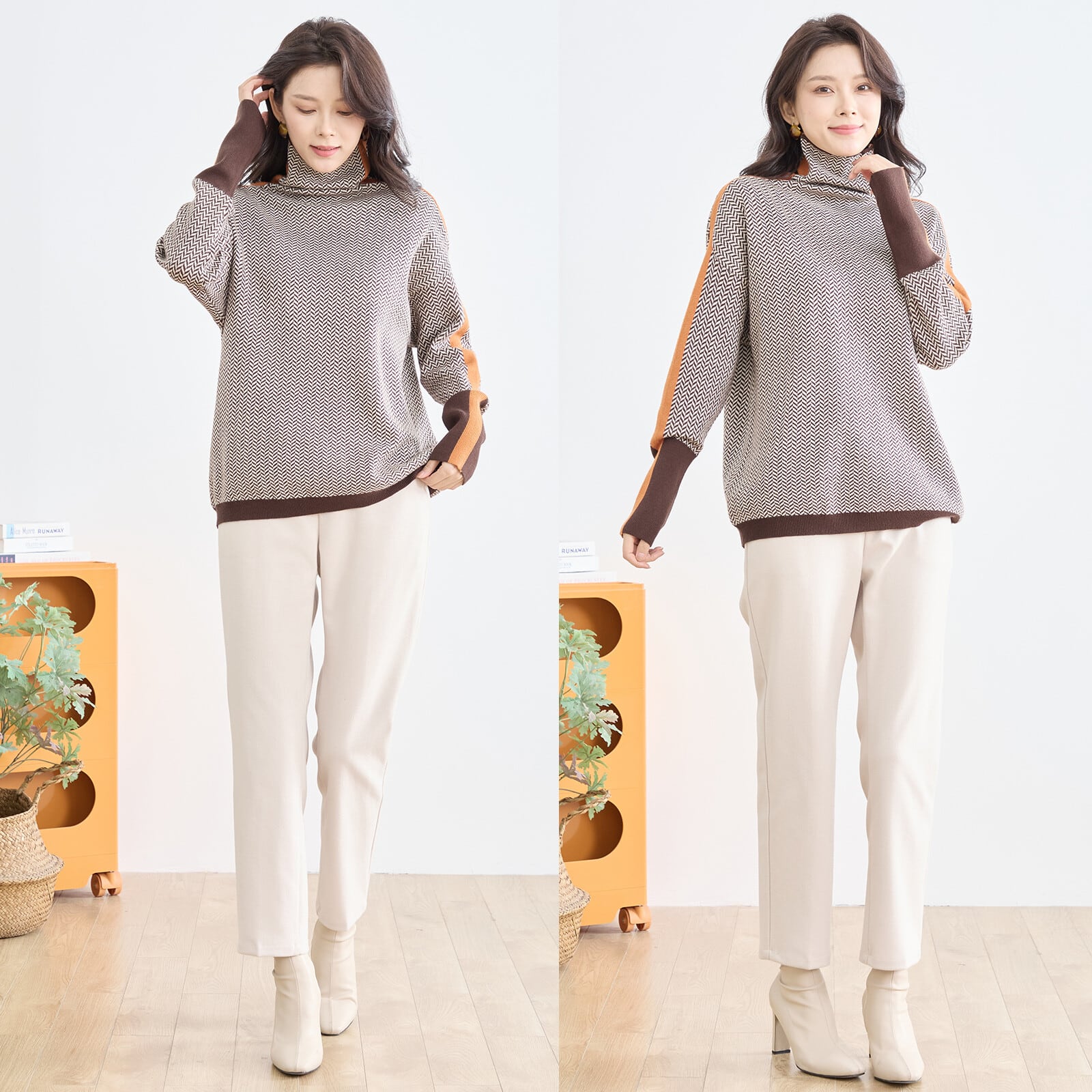 Design]クラシックなヘリンボーン柄が印象的なこのニットトップスは、シンプルながらも洗練されたデザインが特徴です。肩から袖にかけて配されたラインが、スタイリッシュなアクセントとなり、全体に動きのあるシルエットを演出します。タートルネック仕様で首元を温かく包み込み、秋冬のコーディネートにぴったりの一着です。
