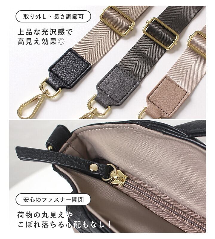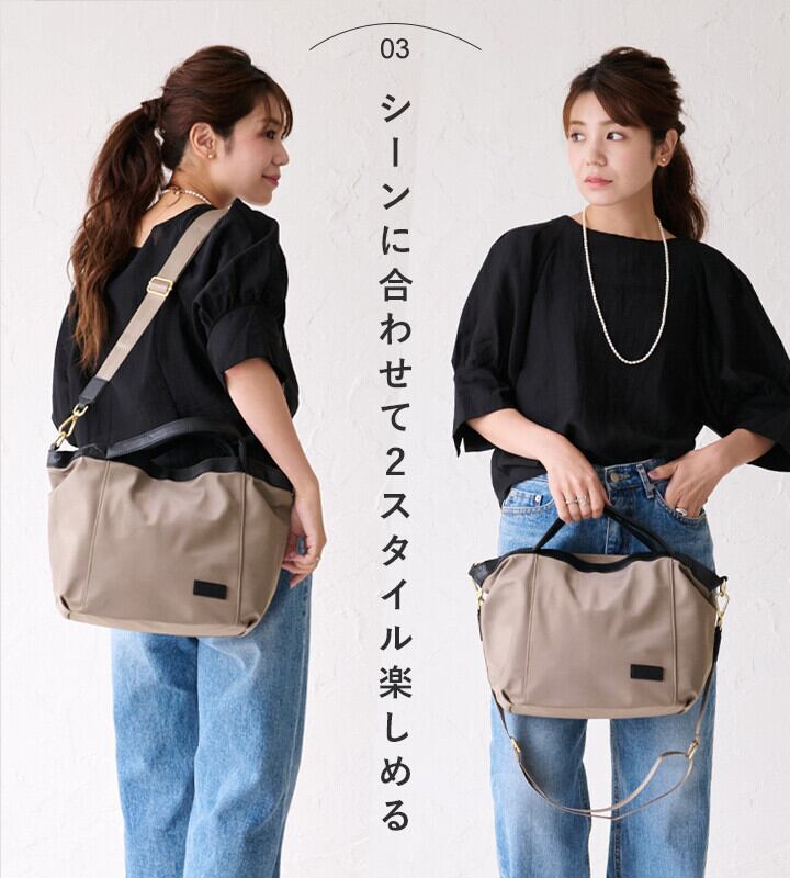 撥水加工の施されたナイロン素材の本体にハンドルやファスナー取っ手などに部分使いされたフェイクレザーが高級感を演出してくれる2Wayバッグです。